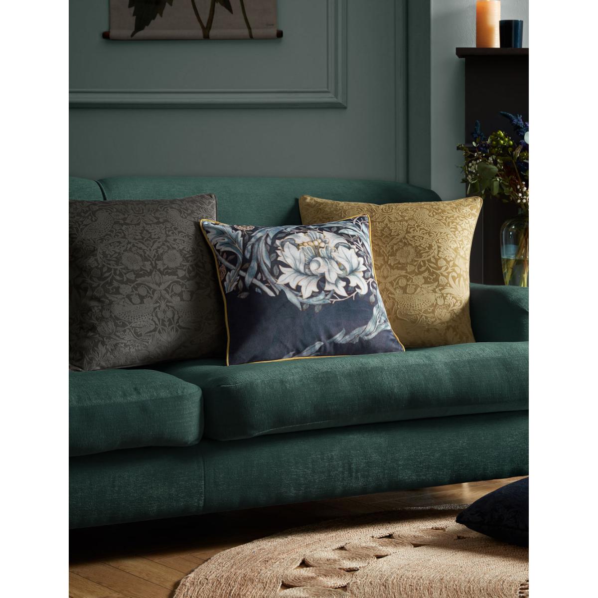 This velvet scatter cushion from William Morris At Home features the iconic Strawberry Thief design. The square-shaped piece is made in a practical medium size, and is filled with feathers for a luxurious sink-in feeling. A piped trim around the edge adds neat finishing detail.