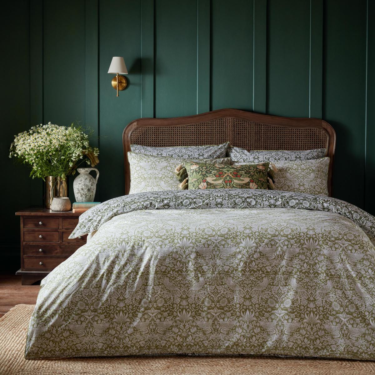 * Luxuriously soft 100% Cotton Composition* Generous 200 Thread Count* Elegant Arts and Crafts design* Button Fastening* Corresponding bedding available for purchase separately Adorn your bed with the iconic William Morris Strawberry Thief Oxford Pillowcase. Designed in 1883, this popular Arts and Crafts pattern is coloured in a rich olive green and warm cream palette on the face, with a fresh lighter green on the reverse. The 200 thread count cotton percale fabric brings the outside in, inspired by Morris’ garden at Kelmscott Manor. The pillowcase features a button fastening and coordinates beautifully with the corresponding bedding. This collection is verified by OEKO-TEX and independently tested for harmful substances as well as manufactured using sustainable processes under socially responsible working conditions. MADE IN GREEN by OEKO-TEX is a unique product label to trace the countries and production facilities - search the product label for more information.