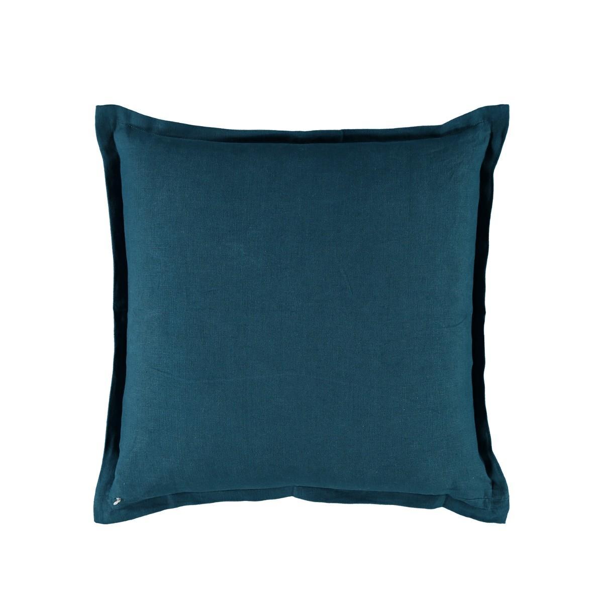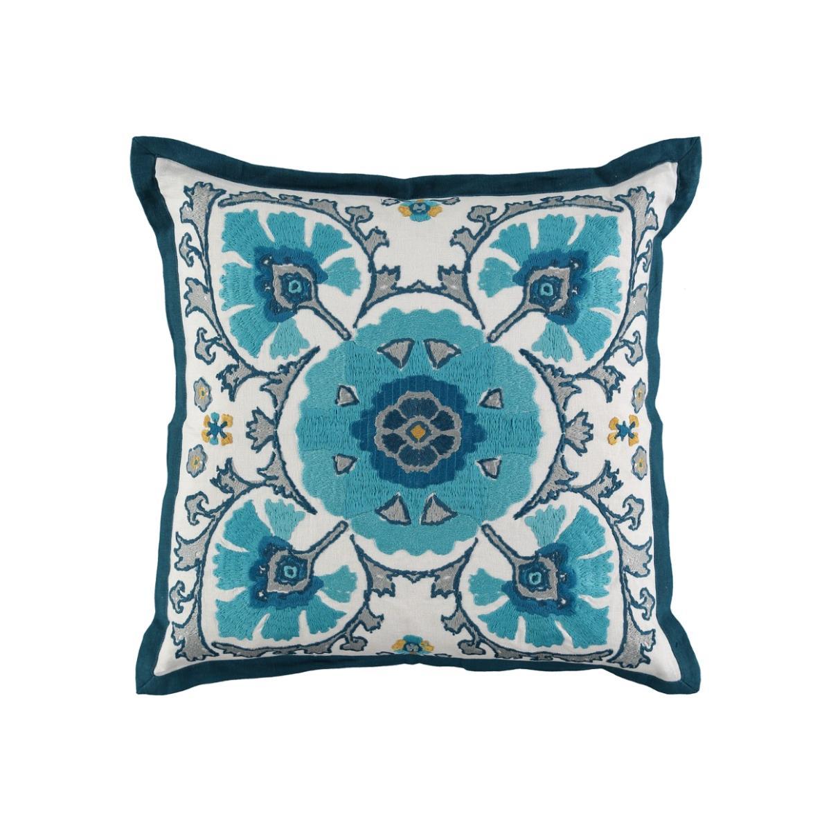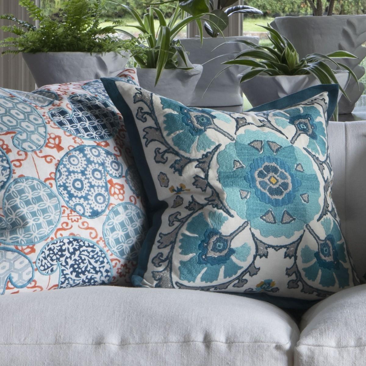 Richly coloured embroidered yarns all but cover this Suzani inspired linen cushion. Finished with a smart teal trimmed border and reverse. Supplied with its feather insert pad.