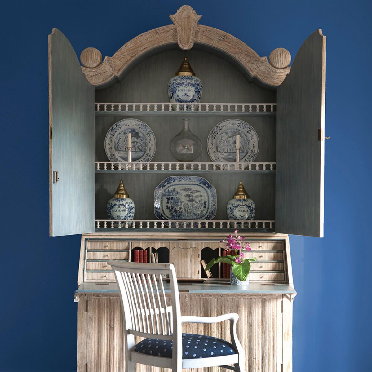 With a treasure trove of storage and countless detailed features, the Alnwick cabinet is an investment piece that will stand the test of time. Crafted from acacia wood with a painted finish, it features a top cabinet with three shelves, each with a dainty balustrade. Beneath this is a pull down surface that reveals several small drawers and more storage space, ideal for stationery, letters and other everyday accessories. The bottom features another double cupboard, making this piece ideal for any space in the home. With blue interior details and exaggerated cornice detailing, the Alnwick cabinet is a beautiful statement piece for any home.