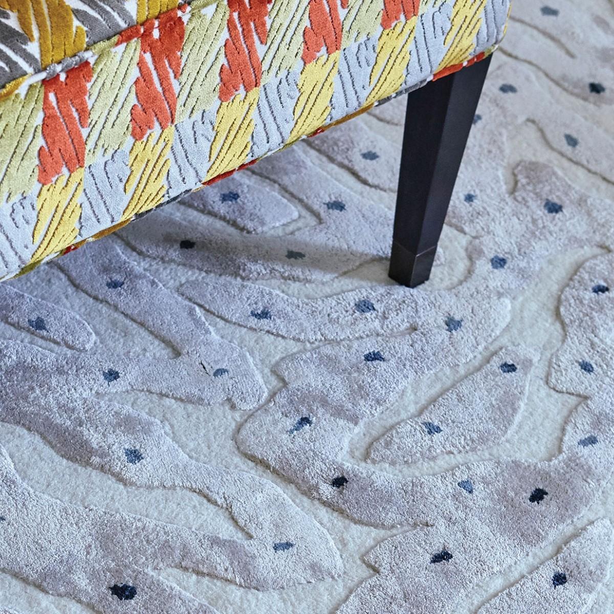 The neutral ground of Amitta is the perfect platform to carry the abstract design of this rug, which was inspired by one of William's sketches of frogs spawn in the early summer drifting on a simple pond. Luxurious in both look and feel, Amitta will sit well in the sitting room, library or bedroom. Hand tufted. Available in 3 sizes.