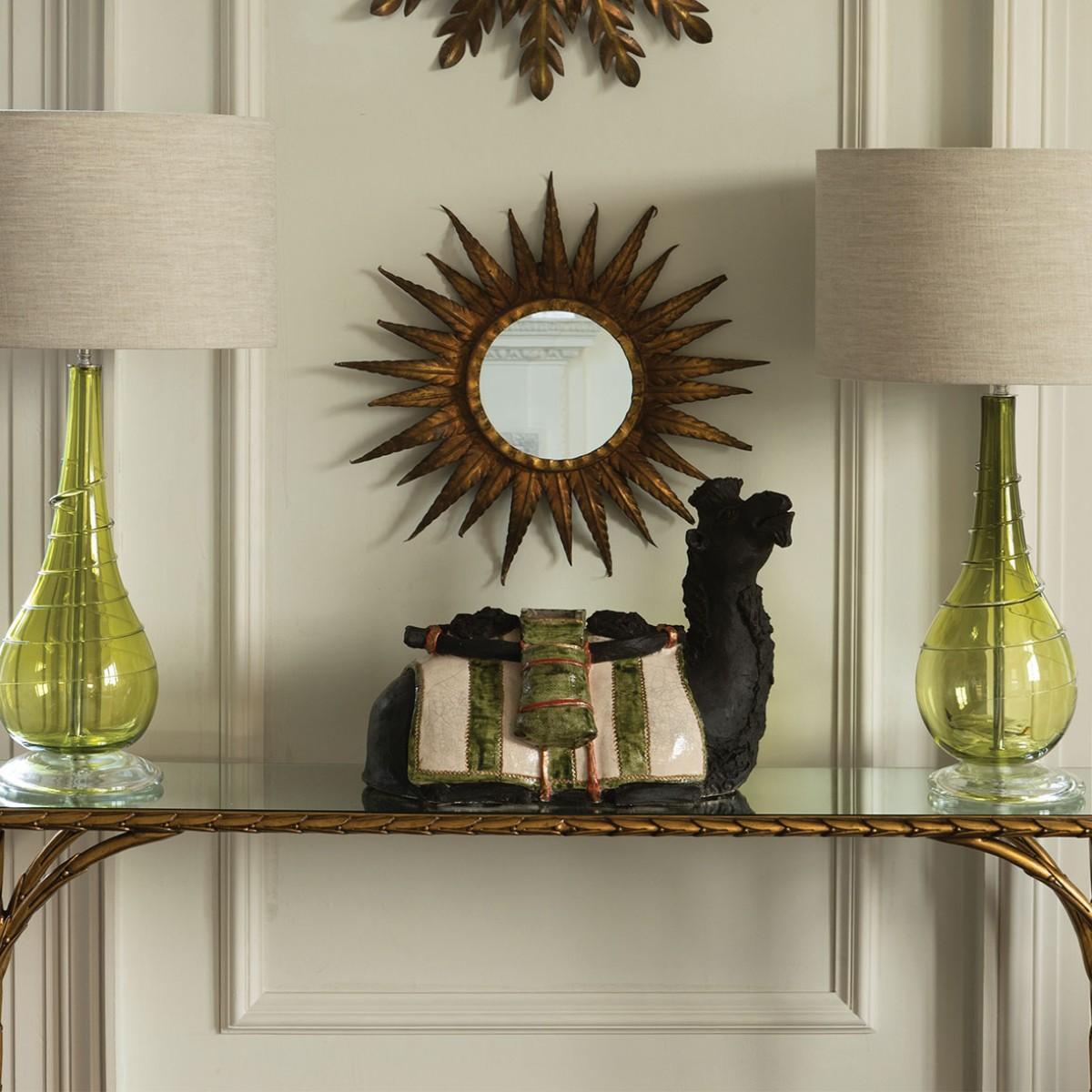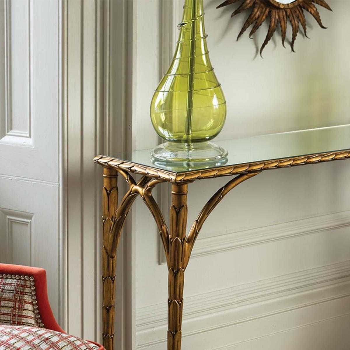 I’m a fan of the Bastian console’s slender gilt-effect frame and clear glass top - it feels light in the space yet brings a touch of refined glamour. Its clean lines and subtle bamboo motif make it equally at home in contemporary, mid-century or more traditional settings. Styling-wise, keep the surface uncluttered: a sculptural vase or a small stack of design books alongside a compact lamp. In an entrance hall, pair it with a large wall mirror to bounce light and create the illusion of space, and use a decorative tray for keys or post to stay organised without losing the table’s elegant simplicity.