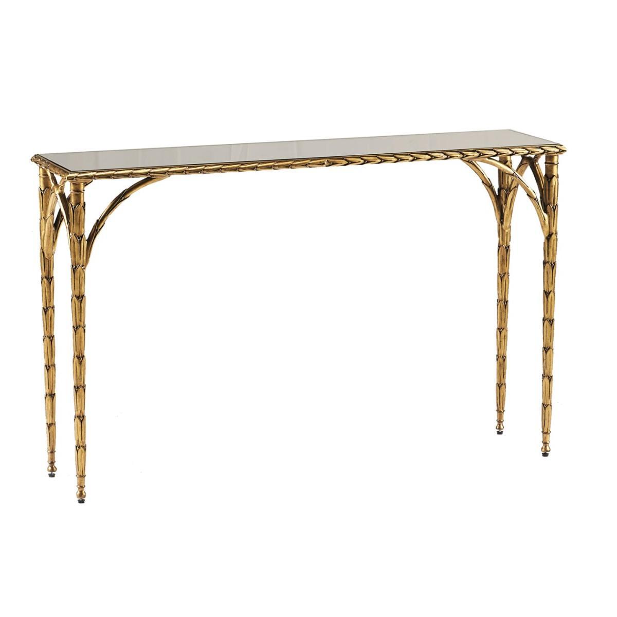 Inspired by a mid-century table owned by William, The Bastian Console table is also a nod to the neoclassical. We have redesigned it for contemporary use in an antiqued bronze finish with just the right amount of matt gilding and with a mirrored top for a sophisticated and glamorous look.