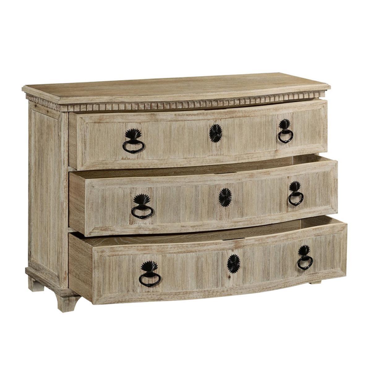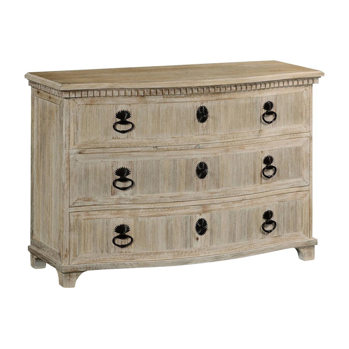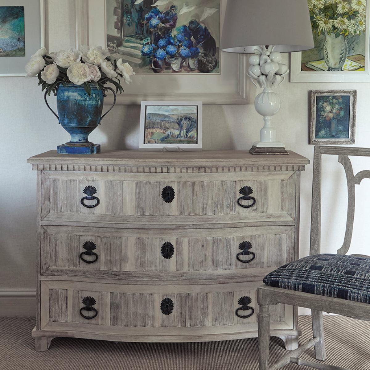 Take it traditional in the home with this Bickerton dresser from William Yeoward. Inspired by an English 18. Th. Century chest, this dresser has a classic bow-fronted shape and three wide drawers. Expertly handcrafted, it’s made from grey washed acacia with contrasting black metal detailing on the drawers.