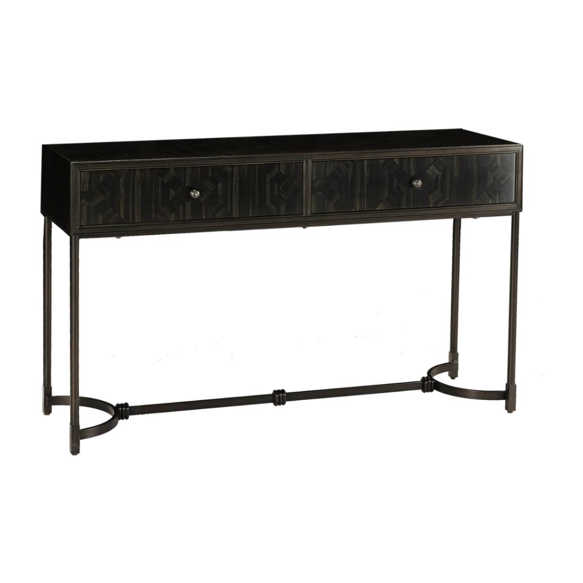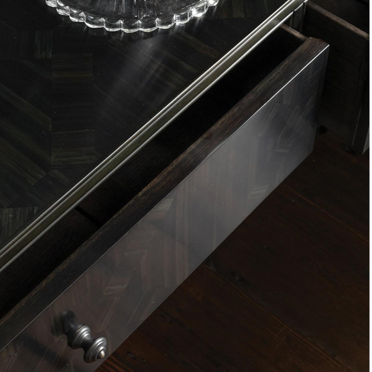 Our Brinkston pieces exude a subtle sense of elegance and sophistication. Marquetry veneer in a rich shades of charcoal has been used to create the stylish geometric patterning. We have paired this with smart metal base in antiqued bronze. The Brinkston Console is sleek, smart and modern.