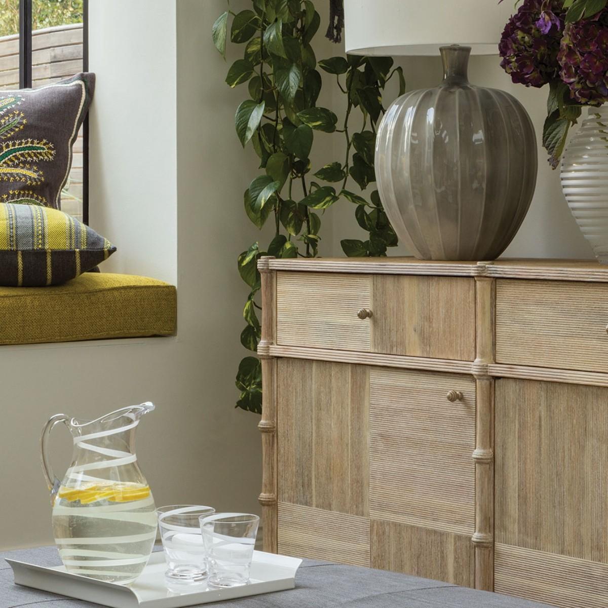 I’m a fan of the Bywater buffet for its fresh, washed-acacia finish and clean-lined proportions - it brings just enough texture without overwhelming a room. Its neutral tone works equally well in Scandi-inspired spaces, coastal retreats or a pared-back contemporary lounge. Styling tip: keep the surface tidy with a pair of low-profile ceramic vases and a slim tray for everyday bits, then layer a framed print or mirror on the wall behind. Inside, use woven baskets to corral dining linens or children’s toys and make the most of those deep cupboards.
