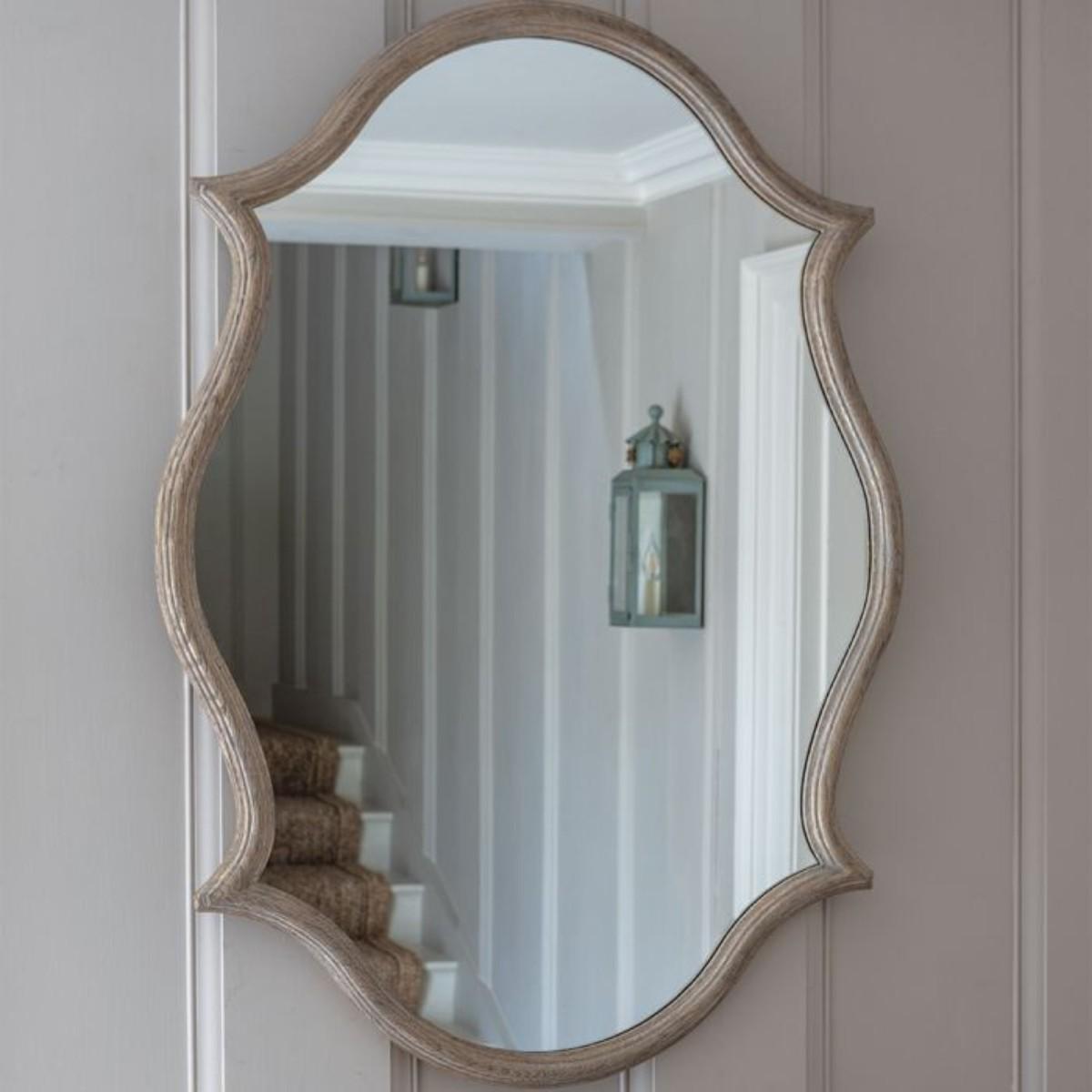 I love how the Downton mirror’s gently curving frame and muted gilt finish introduce subtle character without stealing the show. It sits equally well in a traditional hallway or a modern-classic living room, lifting a pale palette or contrasting richly painted walls. For styling, hang it at eye level above a narrow console or sideboard and add a pair of ceramic vases or a small lamp on either side to balance the curves. In a bedroom, position it above a dressing table to bounce natural light around and instantly make the space feel airier.