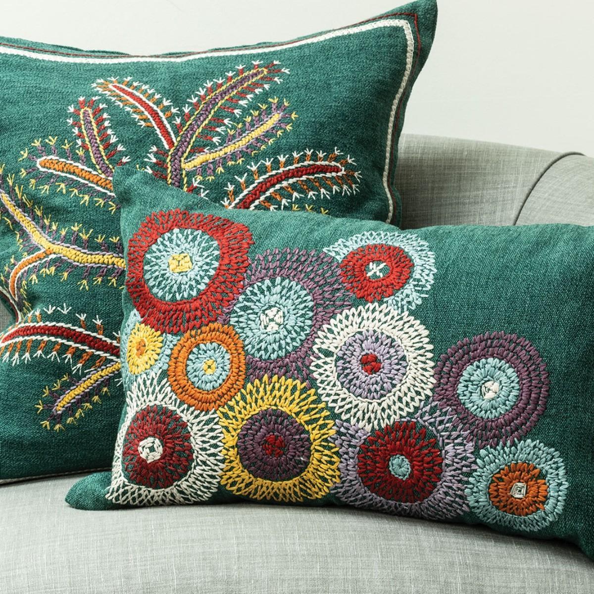 I love this cushion for its vibrant jade hue and the intricate embroidered design-it adds a touch of sophistication without feeling stuffy. It's particularly versatile, working well in both classic and contemporary interiors. For a more layered look, pair it with neutral sofa fabrics to let the colour and detail stand out, or combine it with other textured textiles like velvet or linen for added depth. Practical styling tips include using it to create a focal point on a plain sofa or bed, and it works equally well in living rooms or bedrooms. Its bold colour can also serve as a guide for introducing complementary accessories or artwork, making it a practical yet stylish choice for adding personality to a space.