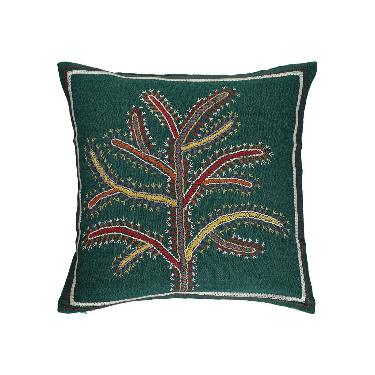 Vibrantly coloured chunky yarns have been used to give this beautiful embroidered cushion a hand stitched artisan look and feel. Exquisite detail overlays a textured and dyed cotton jute ground. Supplied with its feather insert pad.