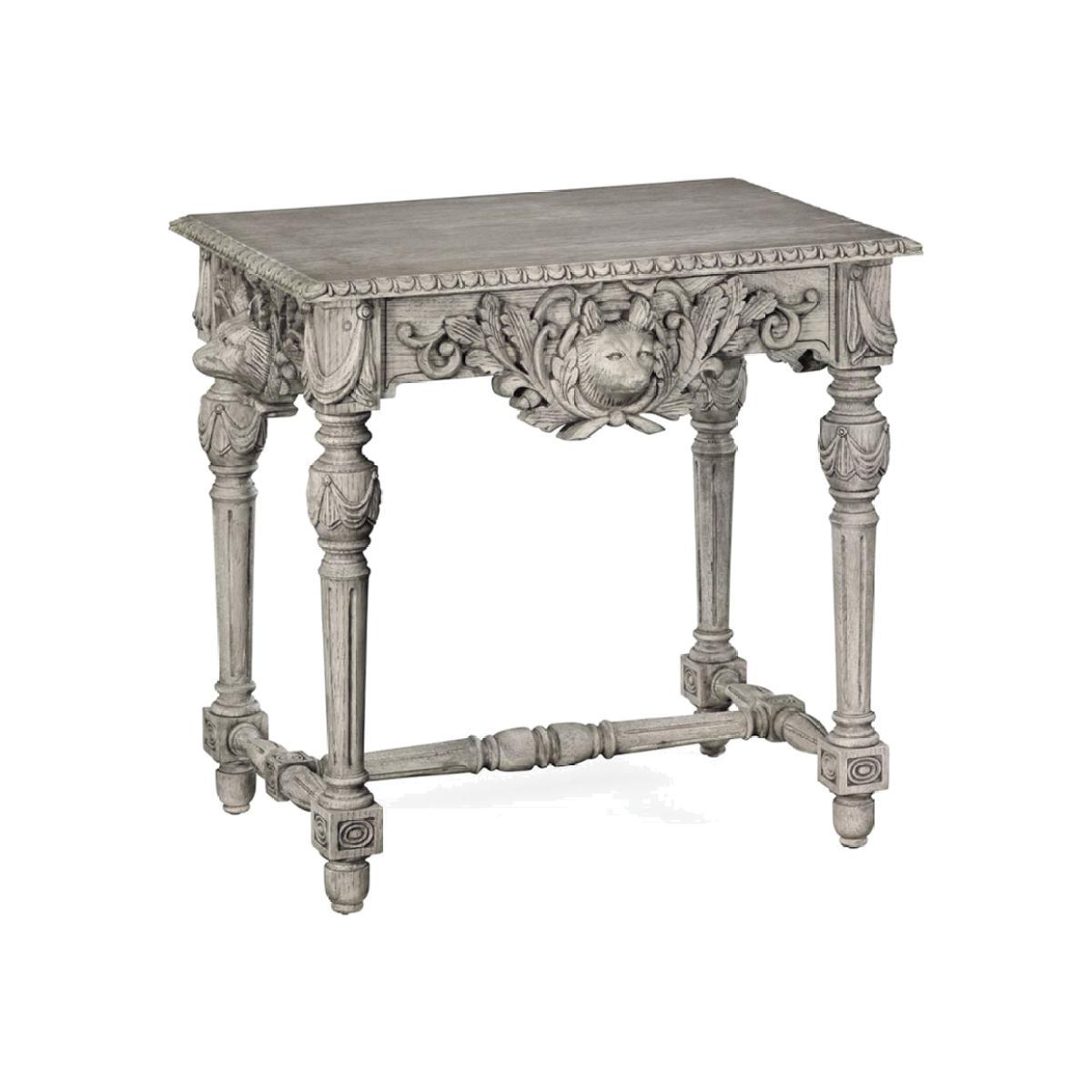 The Godwyn side table is a piece in this collection which I truly marvel at. The amusing fox heads, hand-carved amongst leaves and foliage, make for a pleasing and yet frivolous atmosphere. The front of the table, being a drawer, makes this piece suitable either by a sofa or by the bed. It's important to occasionally add humour to a decorative scheme. Available in 3 finishes; washed oak, greyed oak and country white.