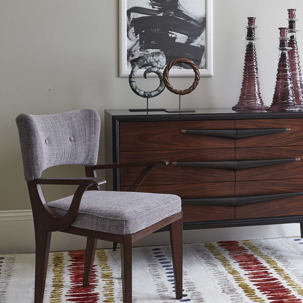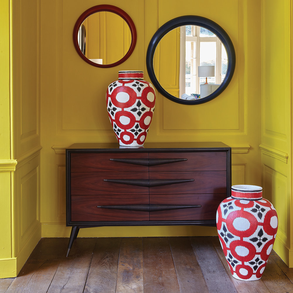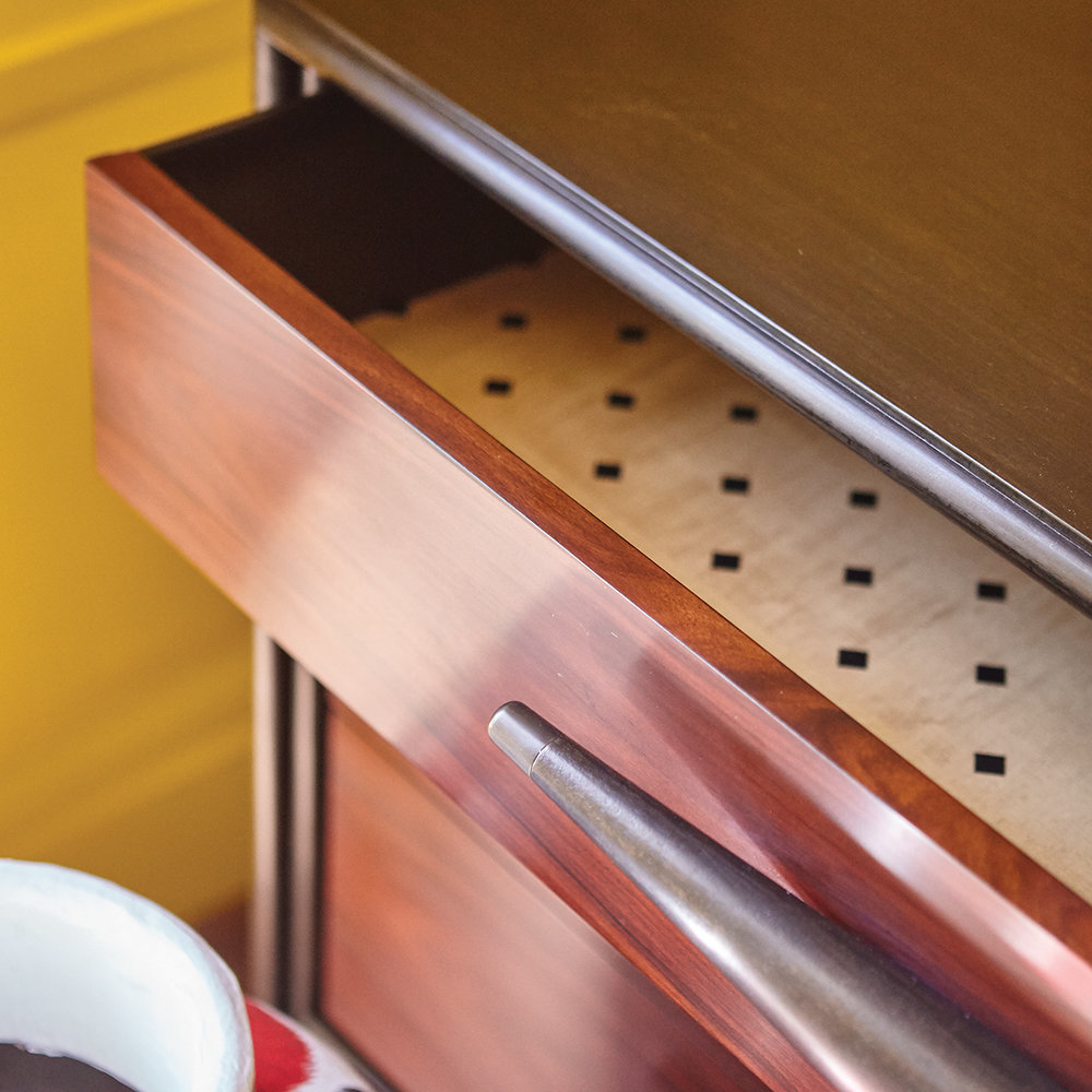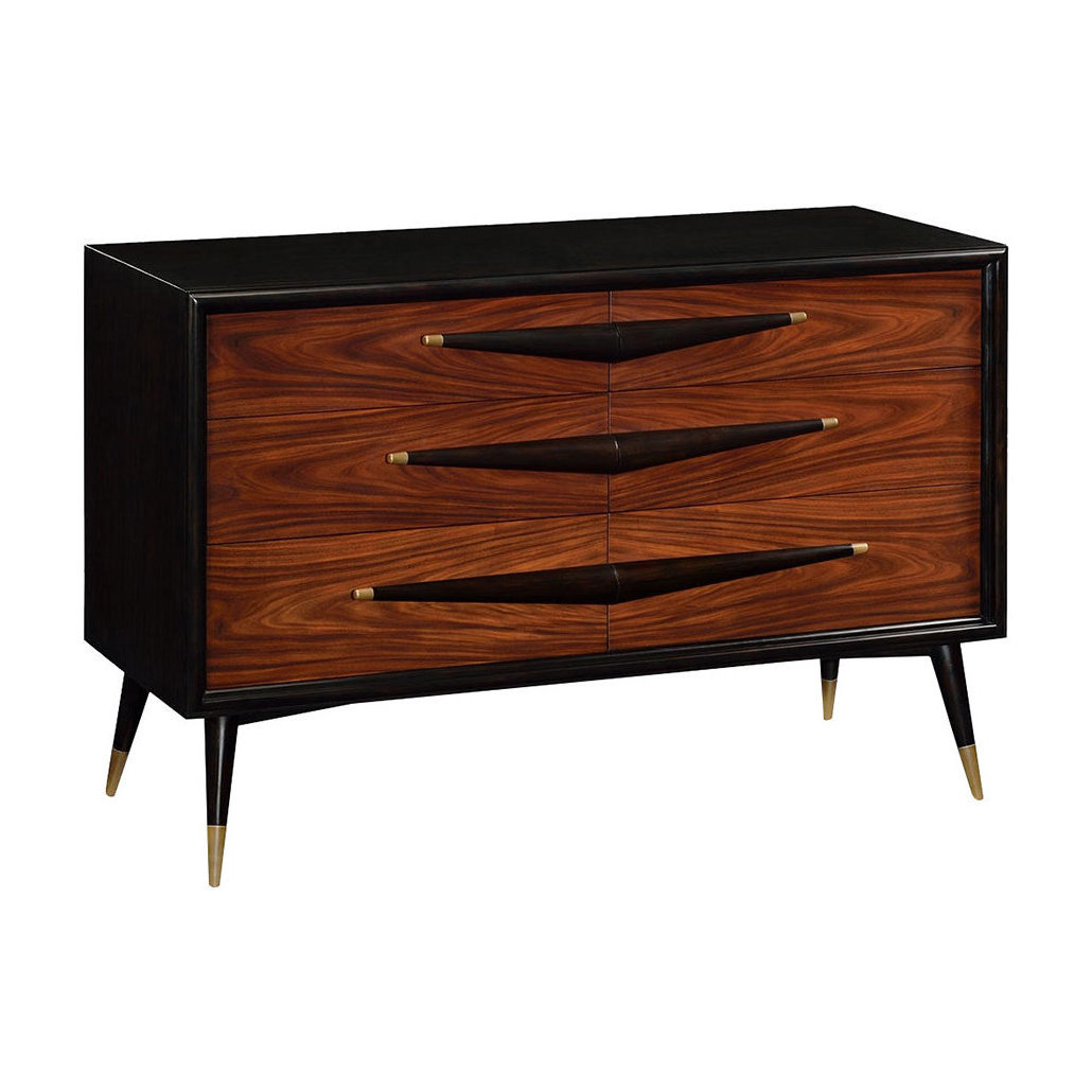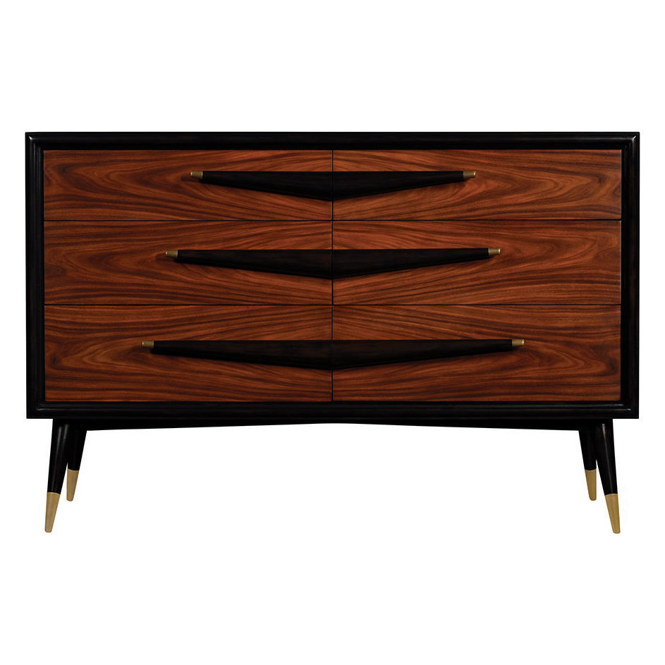 Add a splash of sumptuous design to any room with this Kenosha chest of drawers from William Yeoward. A decadent blend of Mid-Century Modern and Paris retro design, it features dark wooden drawers with visible wood grain with a contrasting black frame and legs. Simply sleek. Key features: * Chest of drawers * Material: wood * Dimensions: H82xW127xD50cm * Mid-Century meets Paris retro feel * Natural grain pattern on the drawers * Sleek black frame and legs * Expertly handcrafted