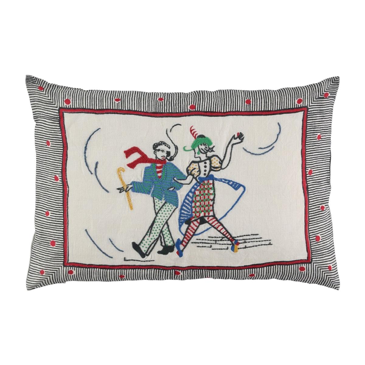 These jolly characters have been exquisitely embroidered in vibrant colours on linen with a printed stripe and spot border. Supplied with its feather insert pad.
