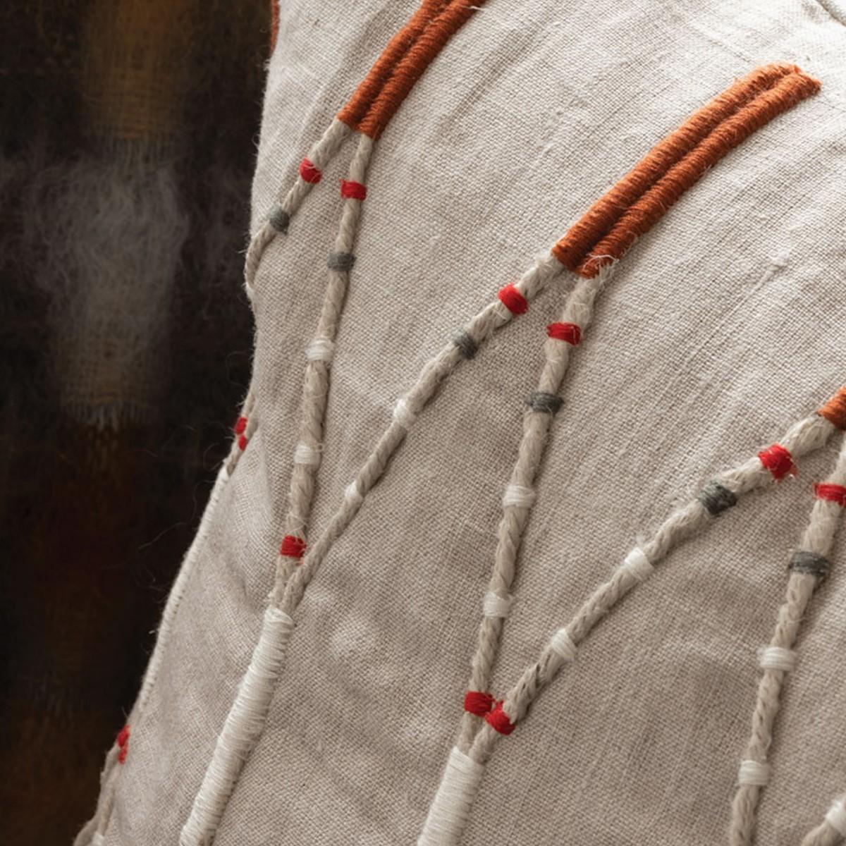 One look at this fabulous cushion and you can literally ’see the artisan stitching this piece by hand'. Great pattern, great stitch work, great colours on a pure dyed linen ground.