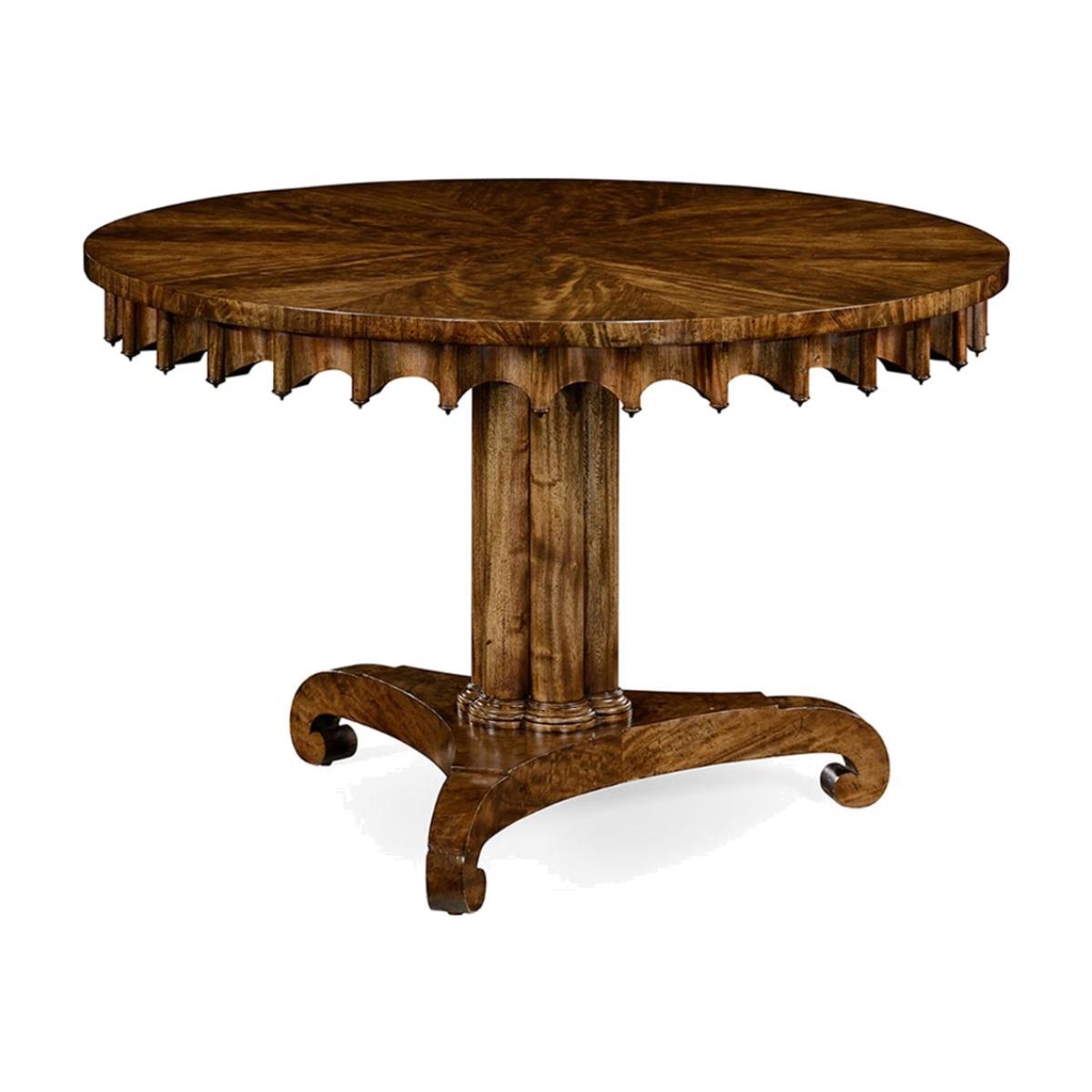 I love this table for its timeless appeal and versatile character. Its grey mahogany finish offers a sophisticated, muted tone that works well in both traditional and contemporary interiors. The round shape encourages intimacy, making it ideal for smaller dining spaces, while the substantial build adds a sense of presence without feeling overpowering. To style it effectively, consider pairing with mixed material chairs-perhaps upholstered or with metal accents-to balance comfort and modernity. Practical tips include keeping the surface clear for a clean look, or adding a simple runner and understated centrepiece for special occasions. It’s a robust piece that combines classic craftsmanship with understated elegance, making it a focal point in many stylish dining rooms.