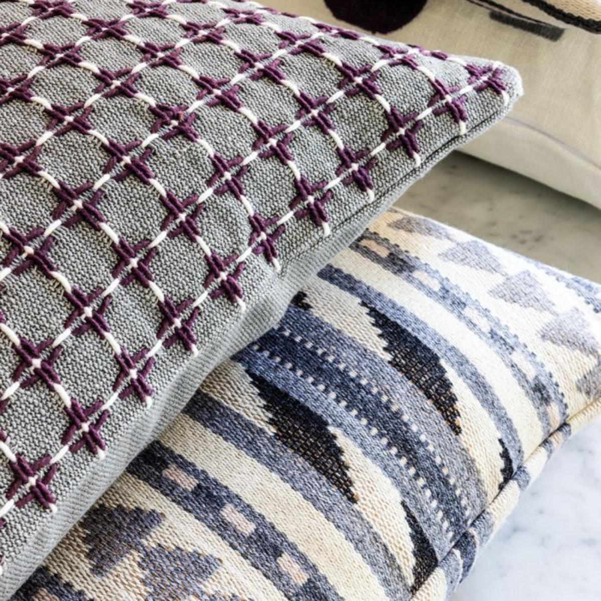 Intricate embroidery and sophisticated stitchwork form the lines and crosses on this smart geometric design.