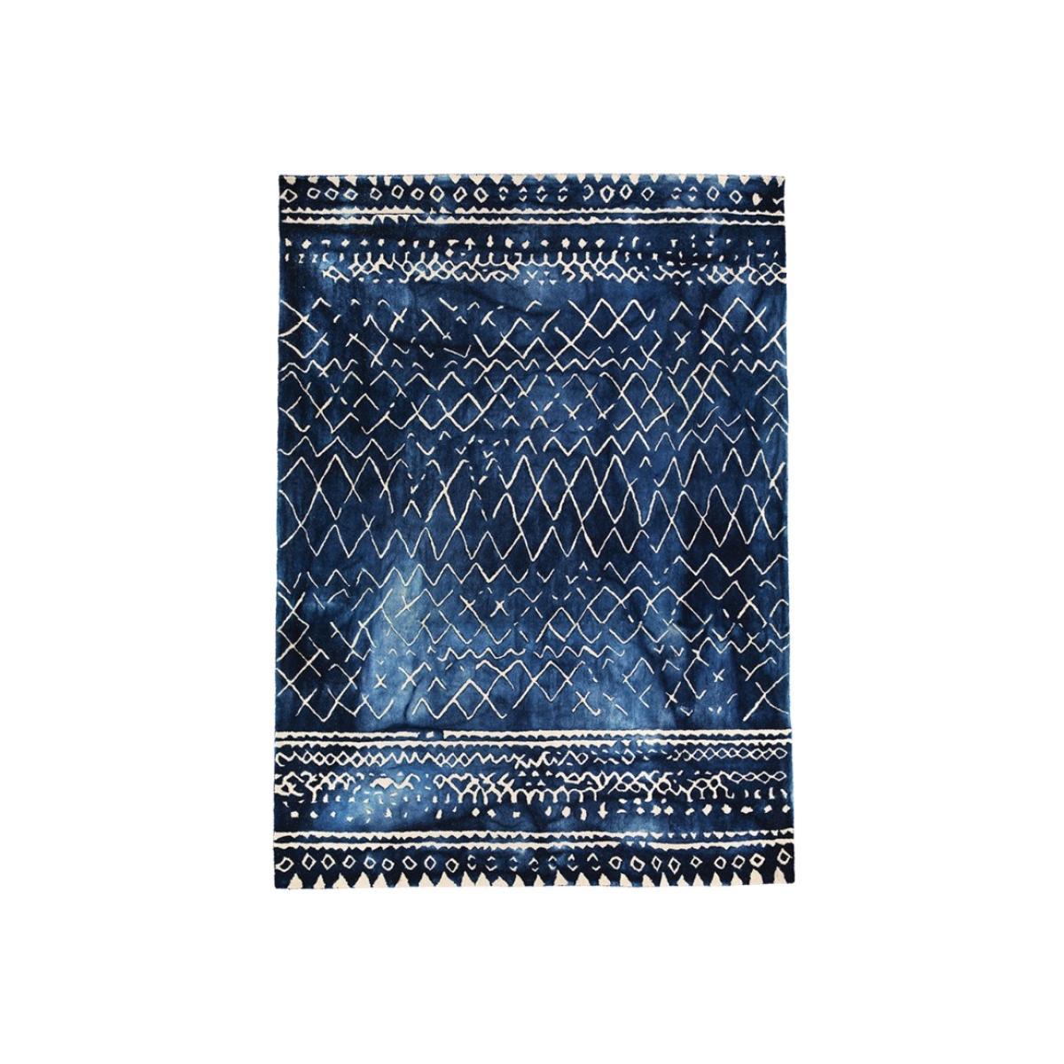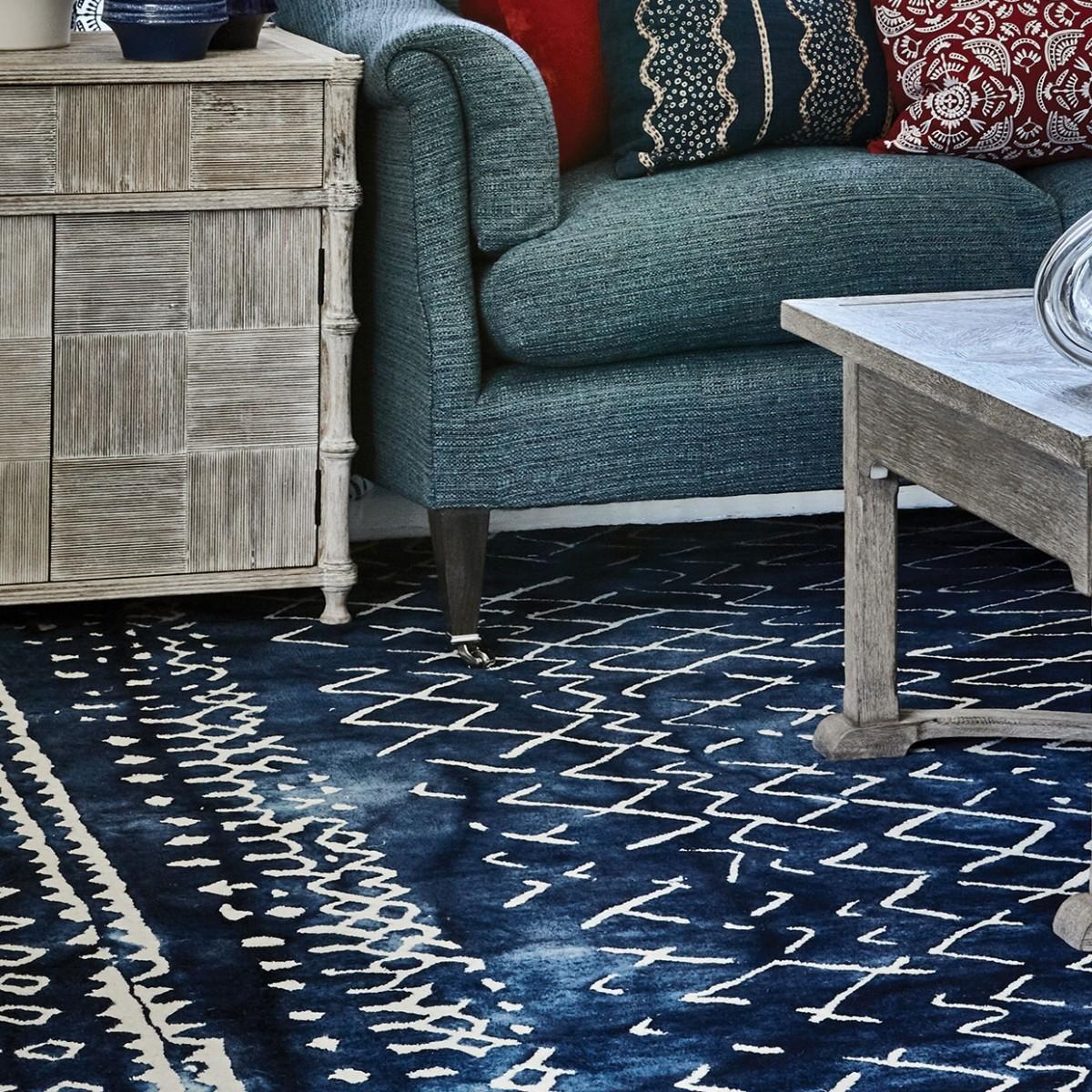 A long time ago I discovered an exquisite hand dyed indigo fabric in a market. It is always so exciting when years later a treasured design finds its moment to shine. This exquisite hand tufted has been double dyed to recreate the original design quite perfectly. Hand tufted, 100% wool. Available in 3 sizes.
