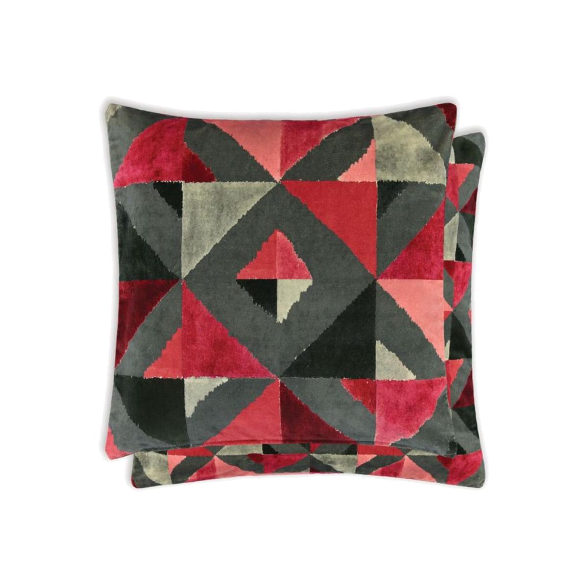 Two scales of pattern have been used to create this dramatic geometric cushion design in Rouge. Large or small – which side will you use? Printed on a beautifully soft velvet ground.