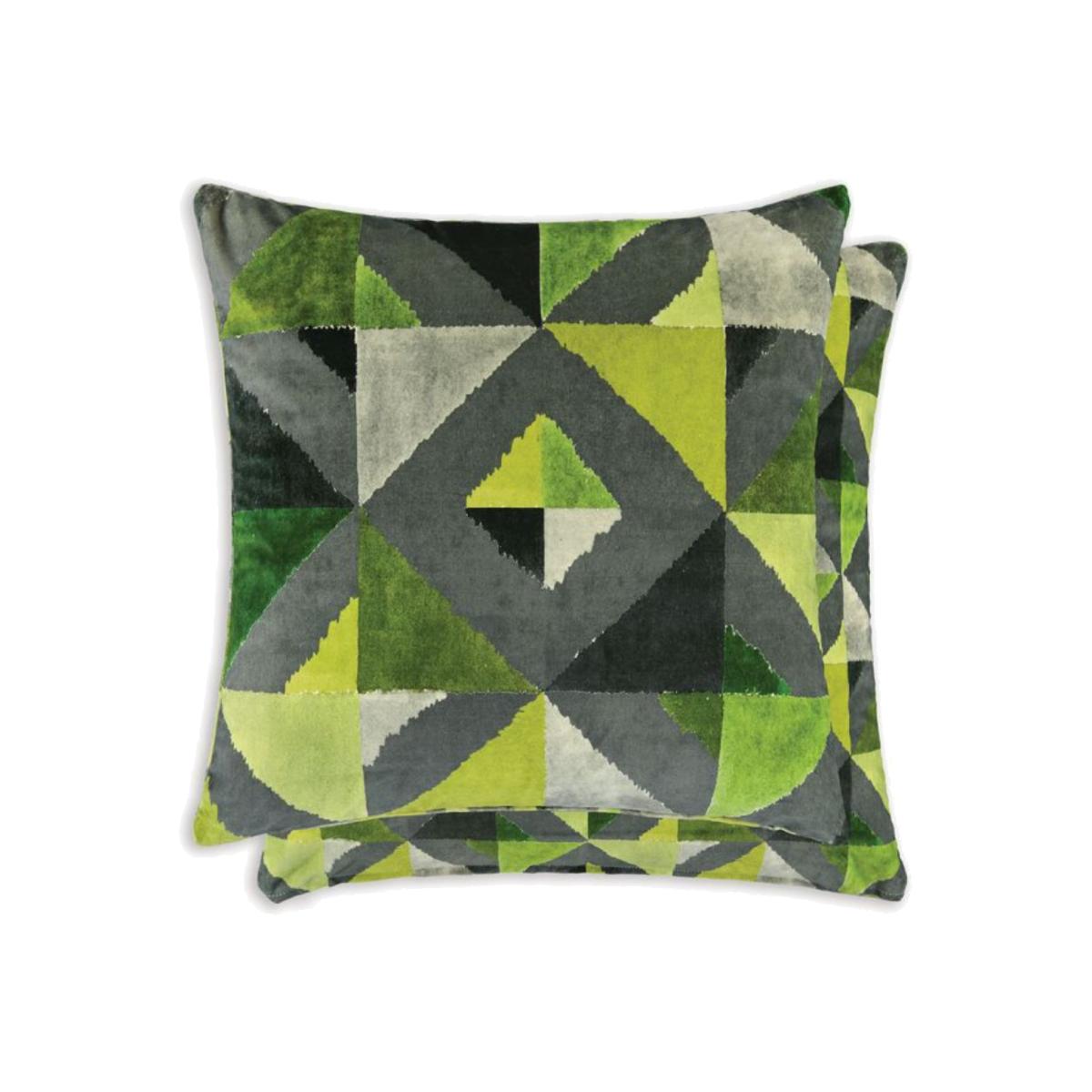 Two scales of pattern have been used to create this dramatic geometric cushion design in Sage. Large or small – which side will you use? Printed on a beautifully soft velvet ground.