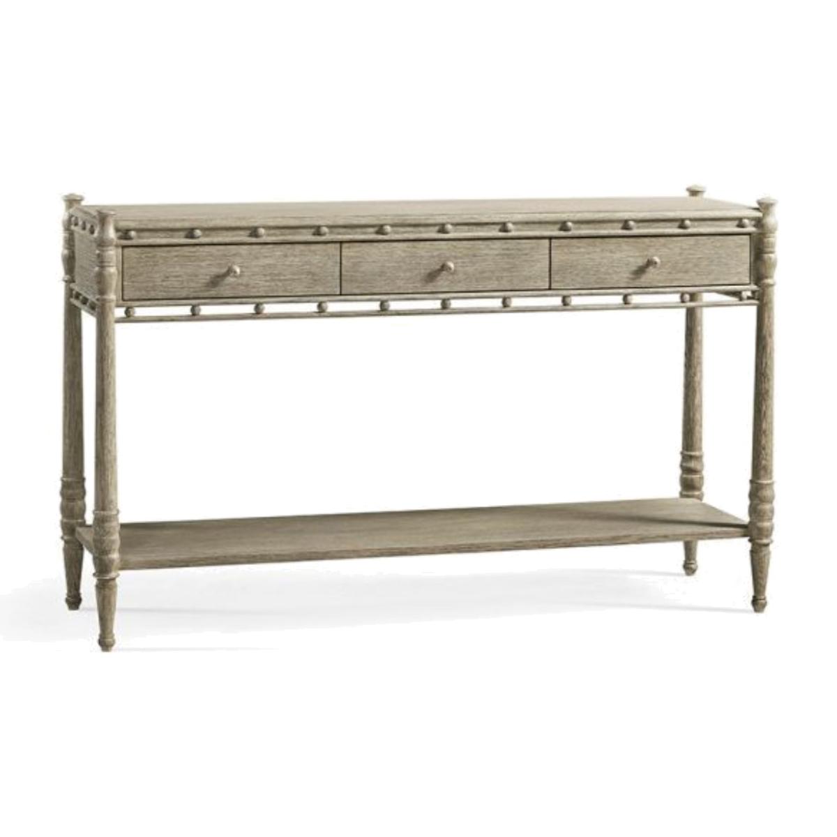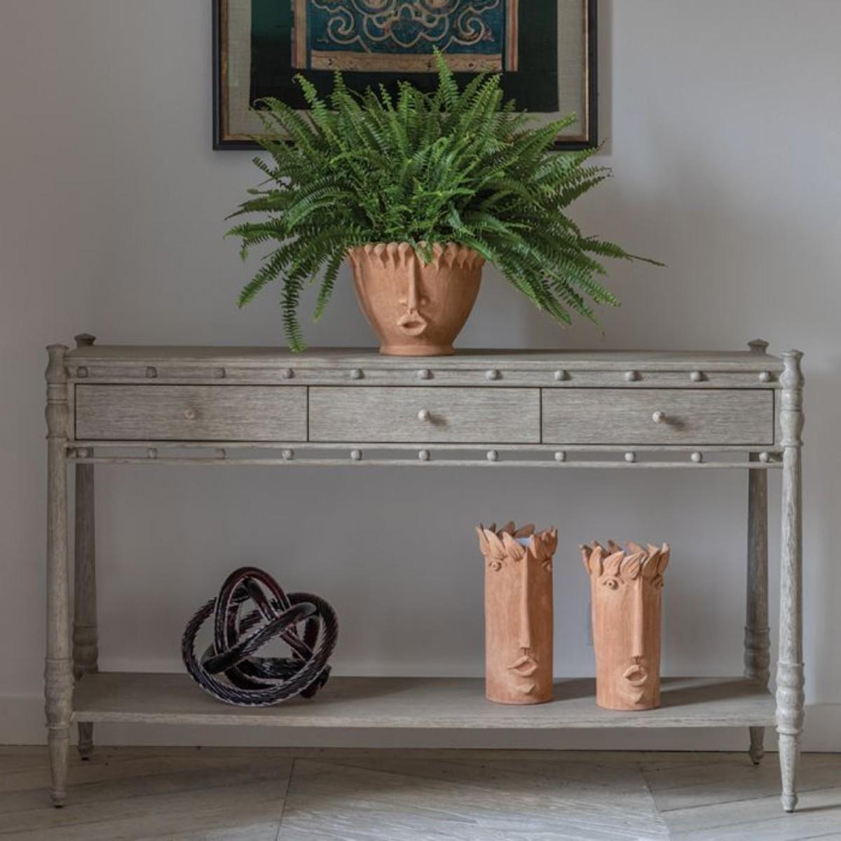 A console table that is both elegant, versatile and completely necessary! Slender and stylish, this console is super versatile in greyed oak with beautiful carved detailing, drawers and shelves.