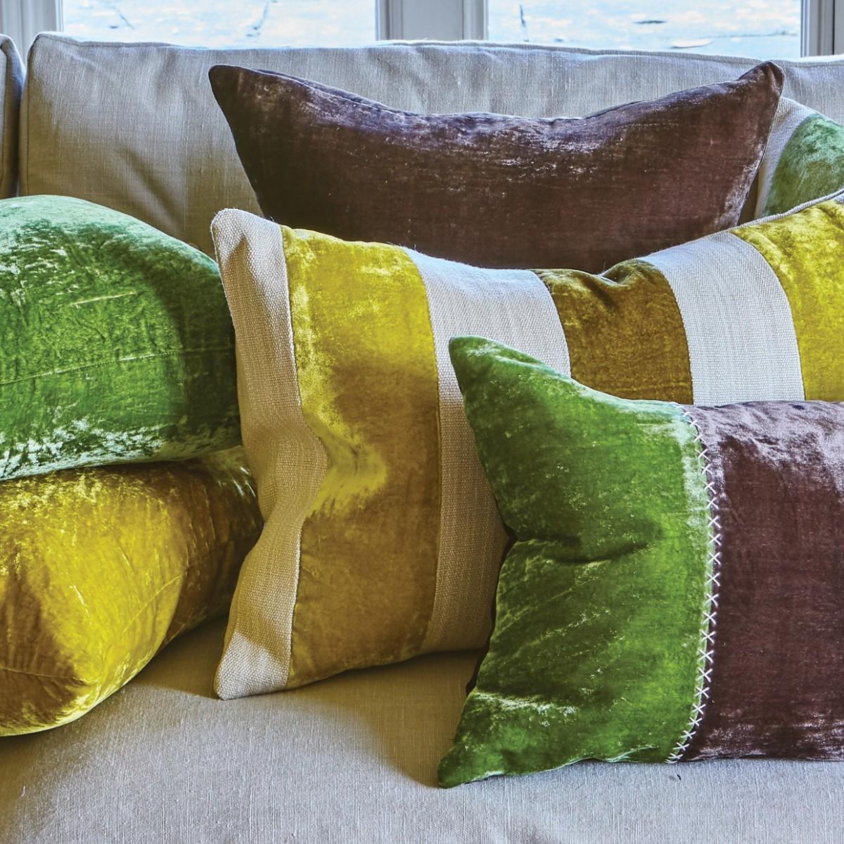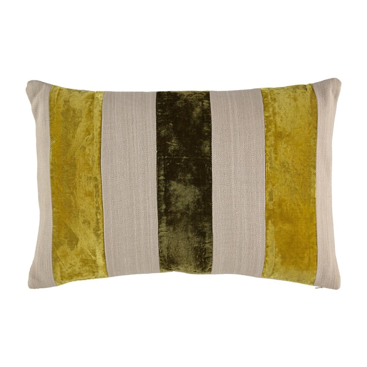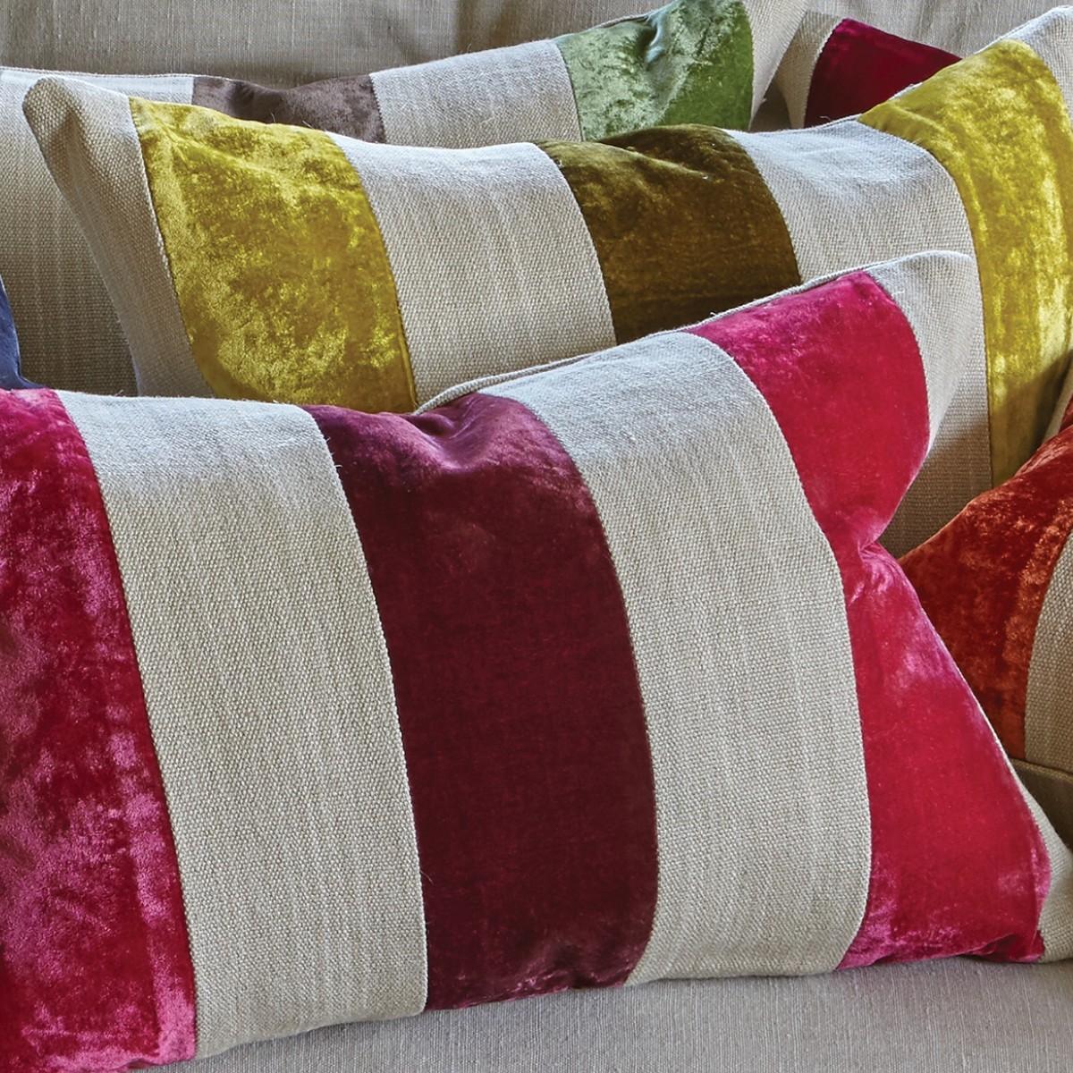 Tonal stripes of sumptuous velvet contrast beautifully with the hand woven, linen coloured background and reverse. Supplied with its feather insert pad.