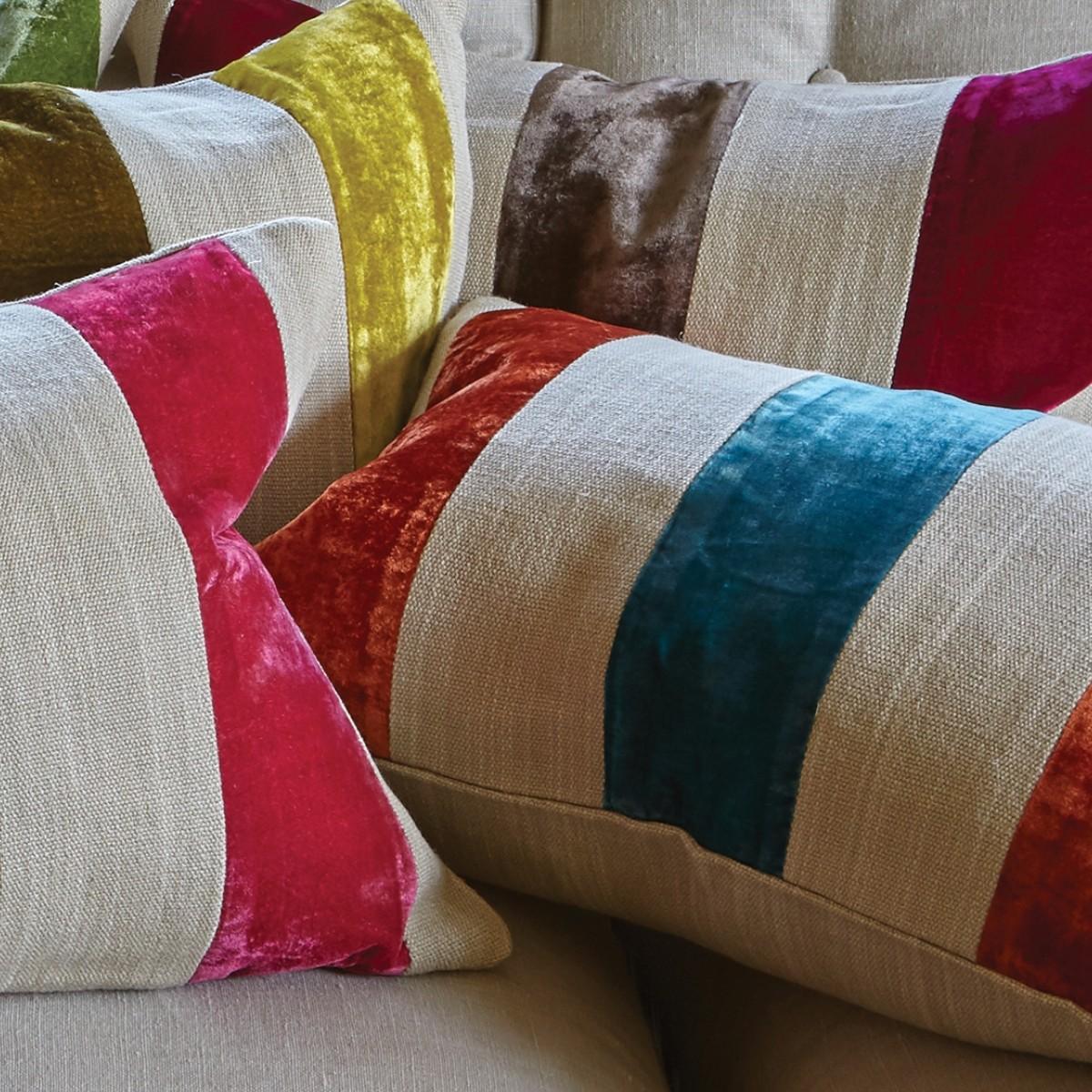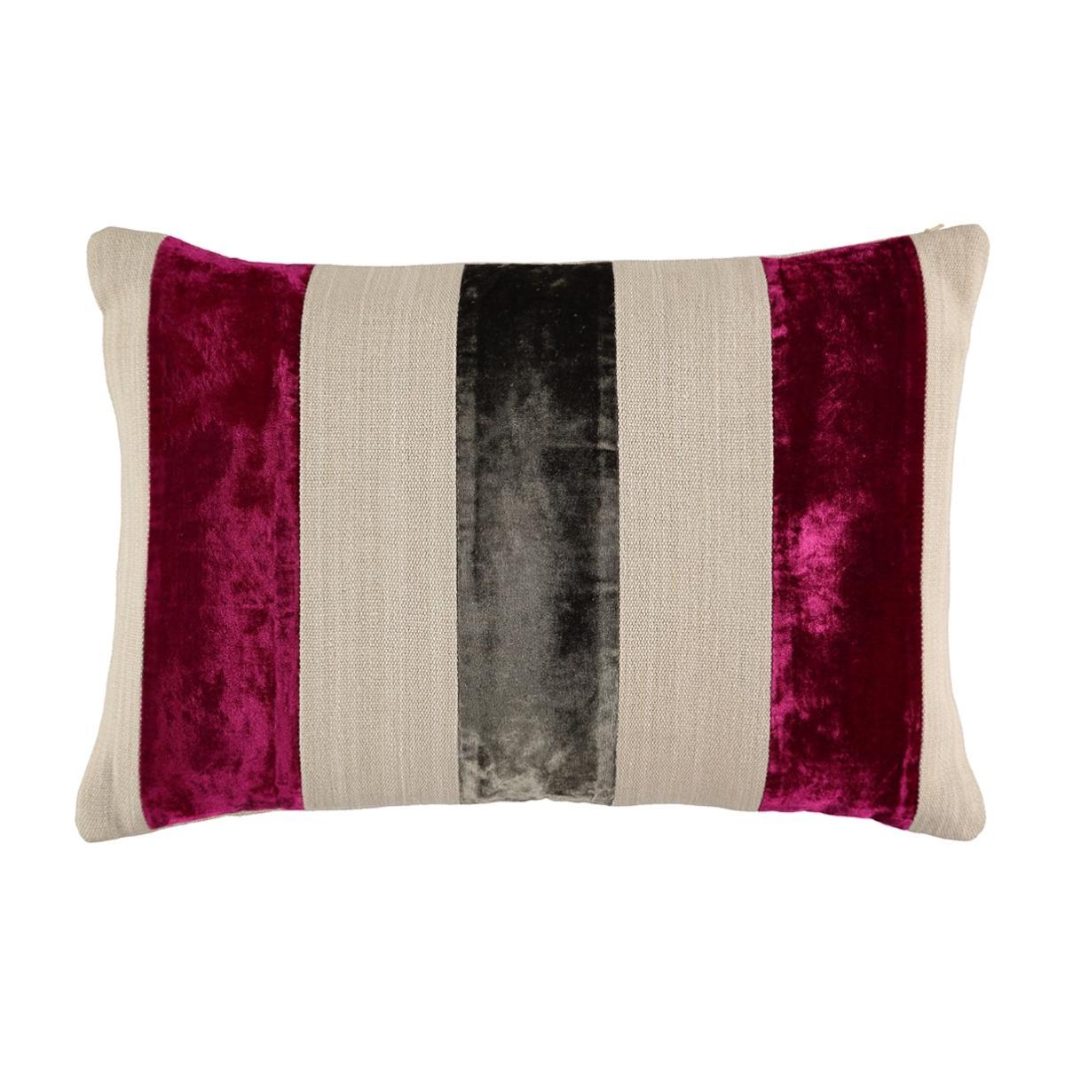 This cushion is a striking choice with its bold fuchsia velvet stripe, set against a neutral background. I love it because it adds a pop of colour and texture effortlessly, making it perfect for both modern and eclectic interiors. It works particularly well on a neutral sofa or armchair to create a focal point, or layered with other cushions in complementary shades for a curated look. Practical styling tips include pairing it with muted tones for a sophisticated feel, or using it as an accent piece to bring energy into a more subdued scheme. Its velvet finish also adds a luxurious touch, making it versatile and eye-catching at the same time.