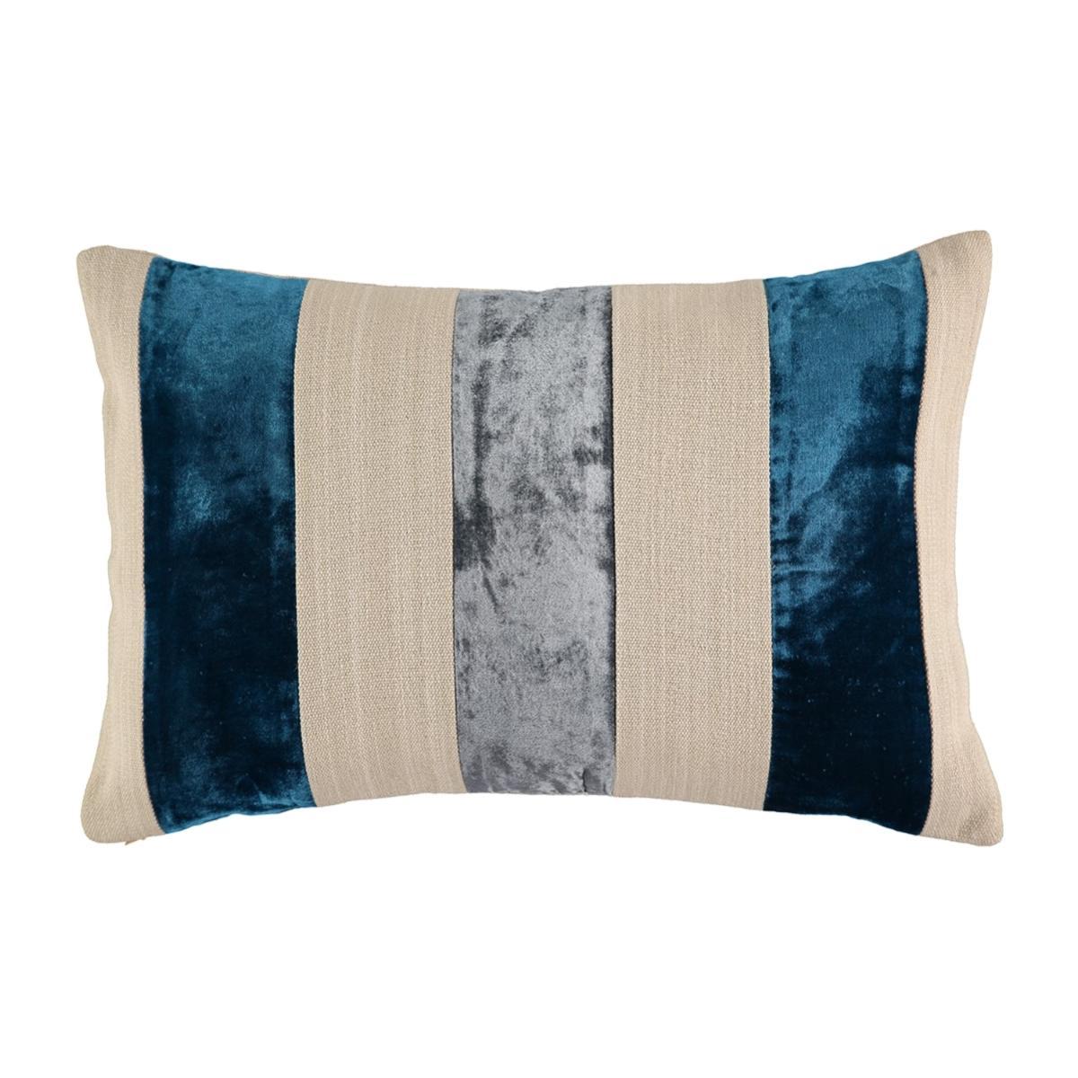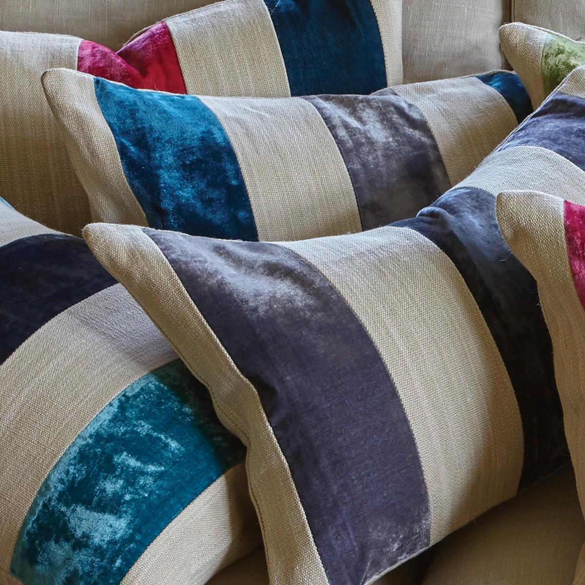 Tonal stripes of sumptuous velvet contrast beautifully with the hand woven, linen coloured background and reverse. Supplied with its feather insert pad.