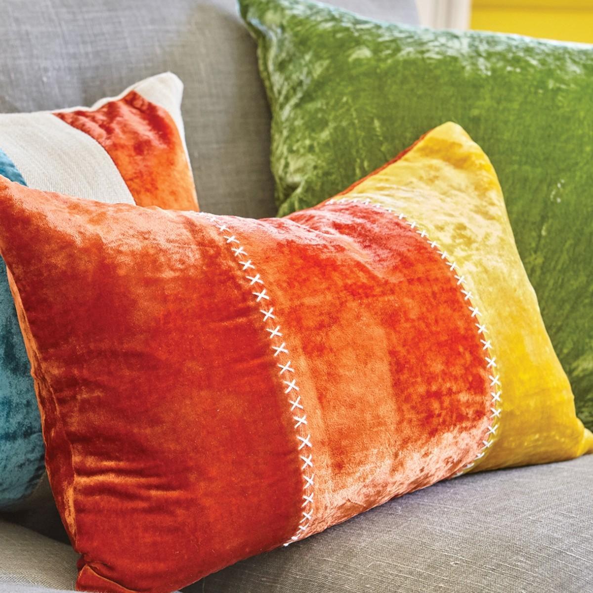 A luxurious velvet cushion that is fully lined and zipped. This simple design is made extra special by its vibrant colour way. Supplied with its feather insert pad.
