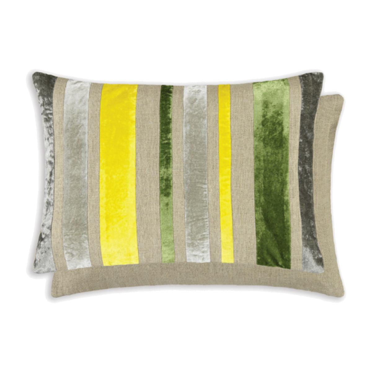 Stripes of beautiful soft velvet in an array of gleaming Citron colours have been carefully stitched on to a beautiful natural linen ground. The perfect coordinate to our Paddy Danny and Kenny plain velvet cushions.