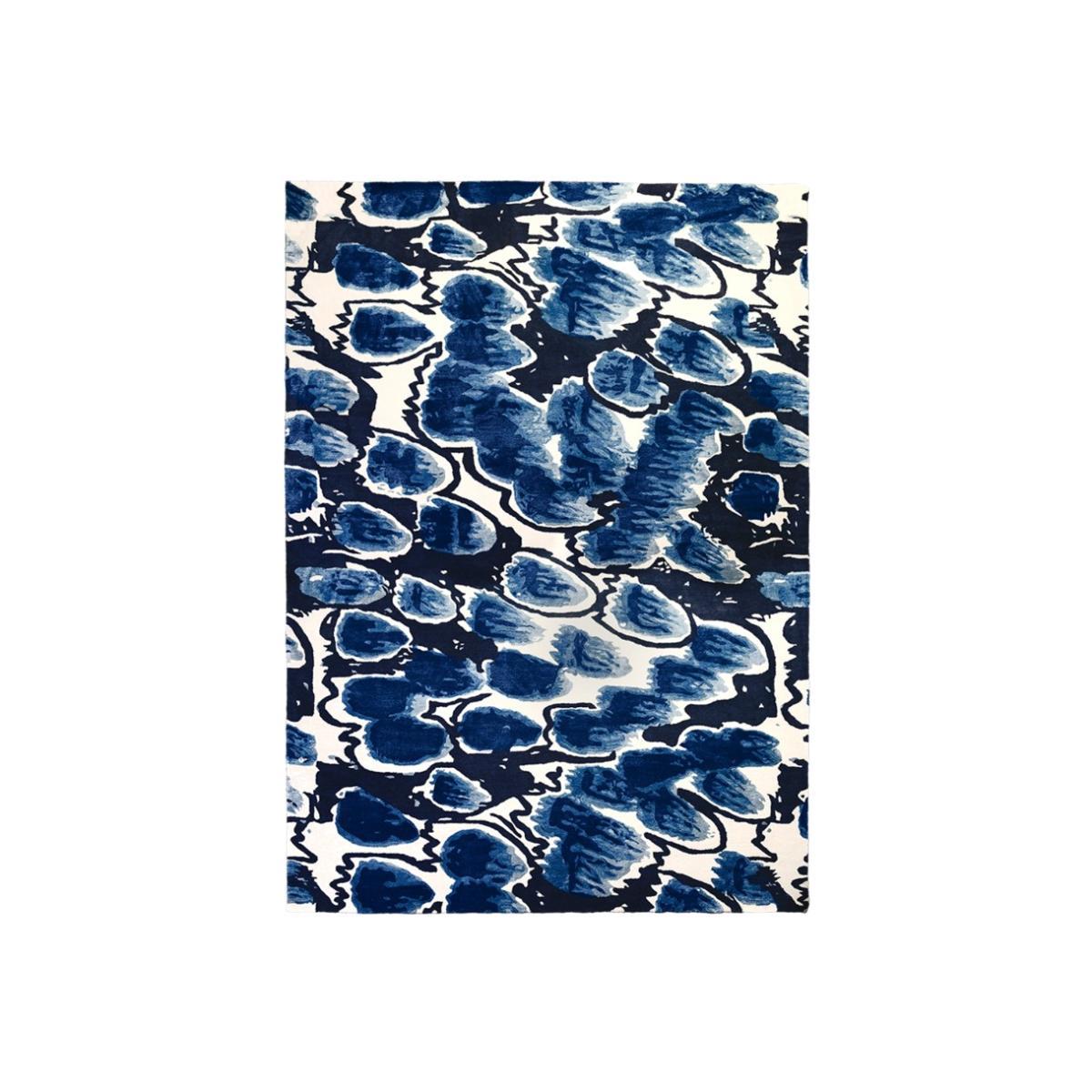This organic pattern retains all the movement of shape and colour of the original painted document that inspired it. Clever use of wool and viscose yarns and the wonderful shades of peacock, denim, indigo and ink combine in a masterly fashion to create this versatile and beautiful hand tufted rug.