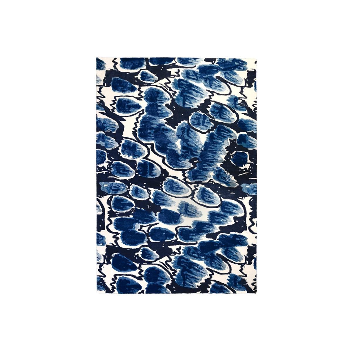 This organic pattern retains all the movement of shape and colour of the original painted document that inspired it. Clever use of wool and viscose yarns and the wonderful shades of peacock, denim, indigo and ink combine in a masterly fashion to create this versatile and beautiful hand tufted rug.