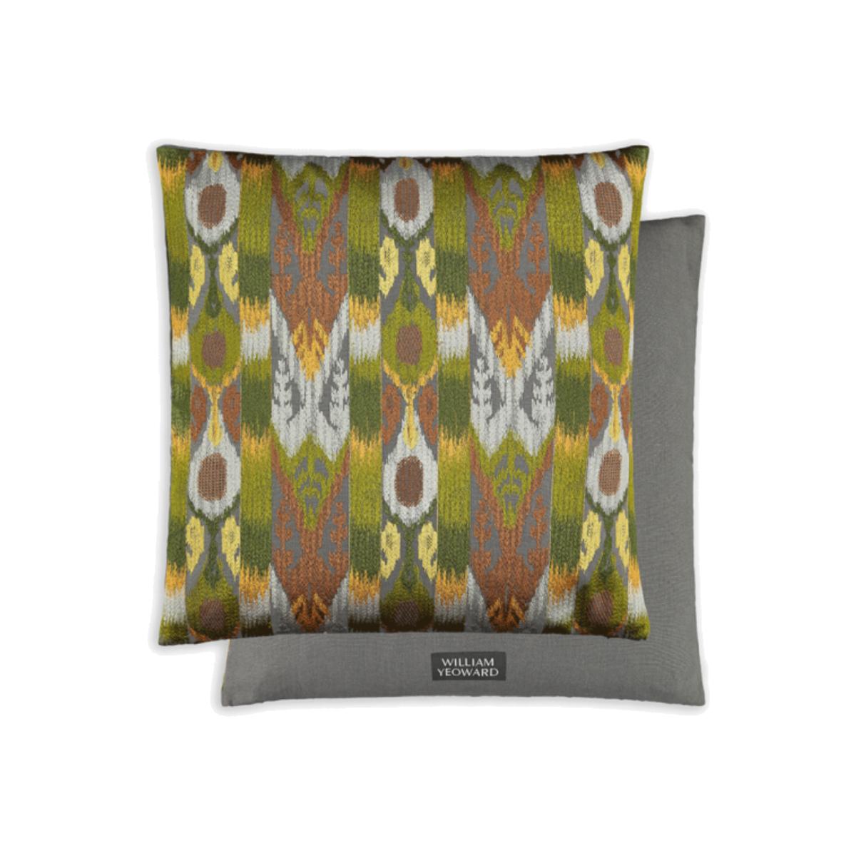 Lustrous silky yarns add a touch of glamour to this beautifully embroidered Ikat patterned cushion in ‘Spice’. Sophisticated and fine embroidery techniques have been used to cover the linen ground. Plain linen reverse.
