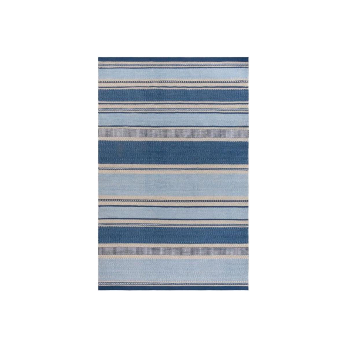 A William Yeoward classic! Blues, greys and white combine to create this perfect striped rug. Just imagine this in your garden reflecting the colours of the sky full of billowing clouds. Cleverly designed and woven for outdoor use, it is equally perfect for use indoors with the look and feel of a woollen flat weave that is full of detail and texture. Available in 3 sizes.