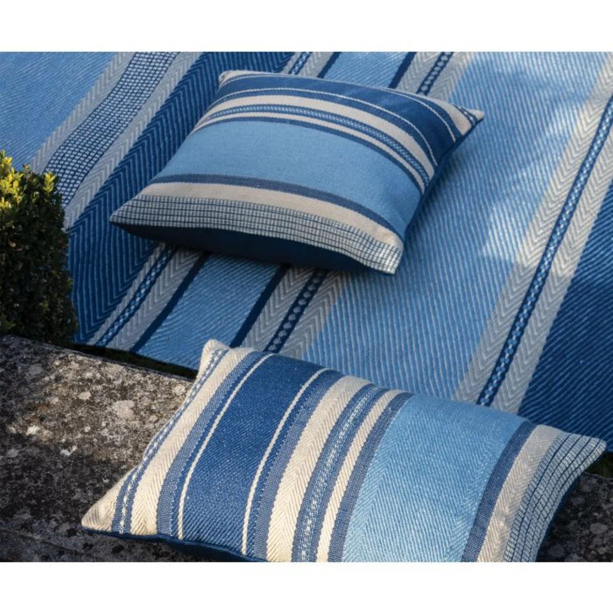 A William Yeoward classic! Blues, greys and white combine to create this perfect striped rug. Just imagine this in your garden reflecting the colours of the sky full of billowing clouds. Cleverly designed and woven for outdoor use, it is equally perfect for use indoors with the look and feel of a woollen flat weave that is full of detail and texture. Available in 3 sizes.