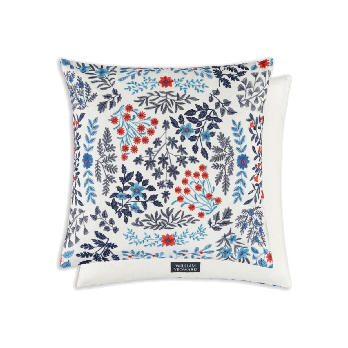 Flowers and leaves abound on this gorgeously embroidered cushion in Indigo with a garland at its centre. A plethora of lustrous yarn colours and stitch techniques have been used on a smart linen ground.
