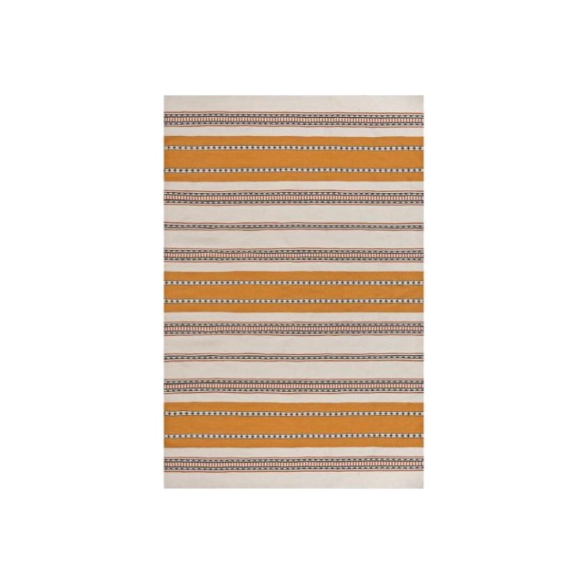 This classic Yeoward stripe is very much a favourite design. Neutral with ochre, the stripes are perfectly balanced and are full of interesting woven detail. This has been so cleverly produced, with the look and feel of a woollen flat weave, that you would never guess it had been designed for outdoor use. Available in 3 sizes.
