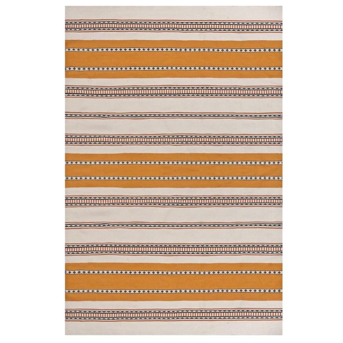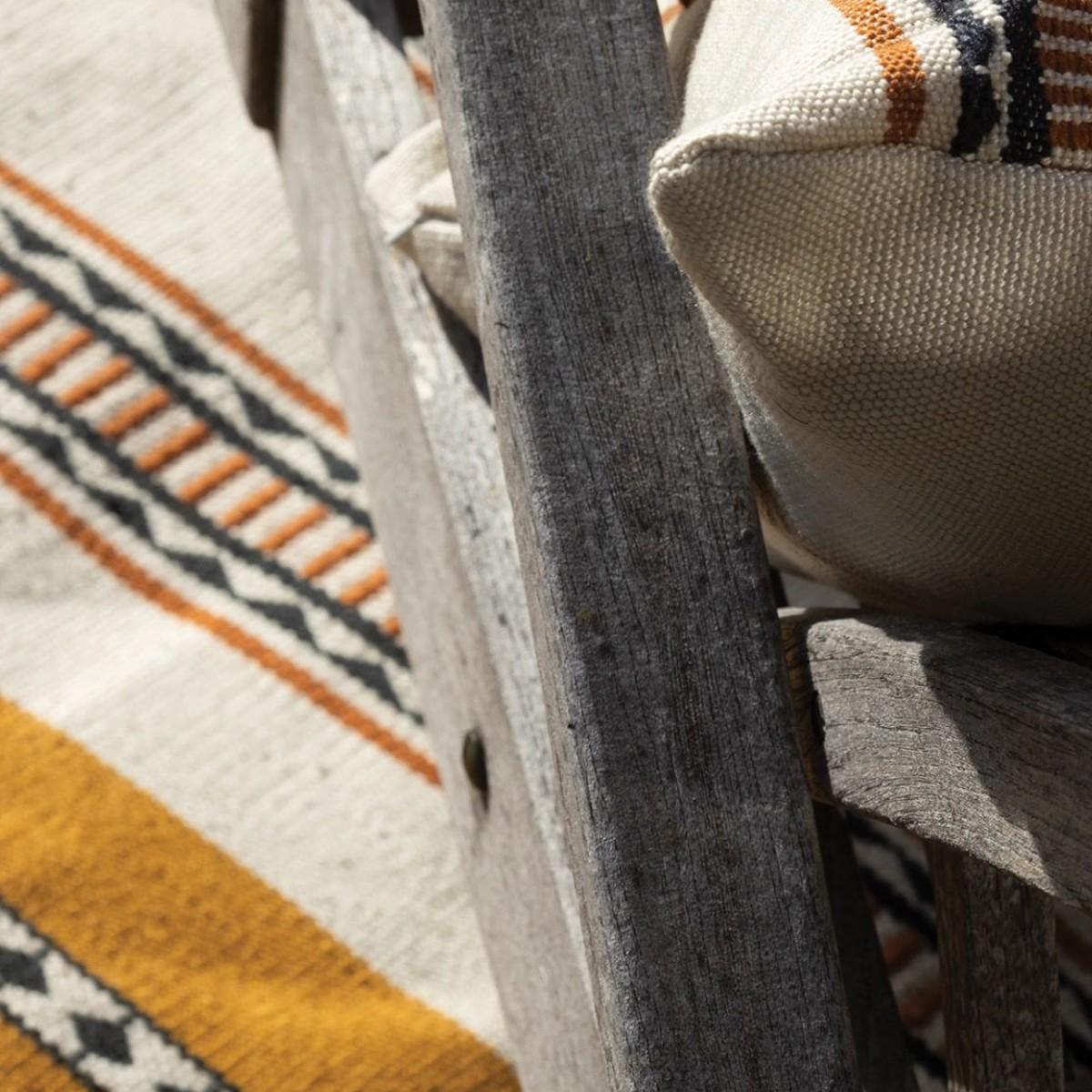 Outdoor or Indoor? You decide! This classic Yeoward stripe is very much a favourite design. Neutral with ochre, the stripes are perfectly balanced and are full of interesting woven detail. This has been so cleverly produced, with the look and feel of a woollen flat weave, that you would never guess it had been designed for outdoor use. Available in 3 sizes.