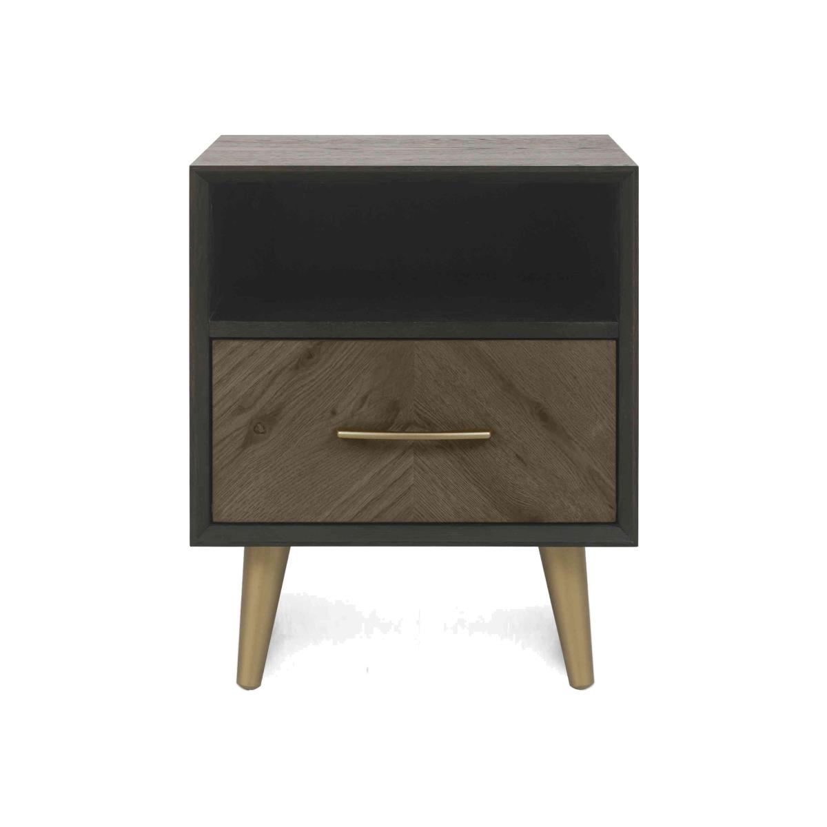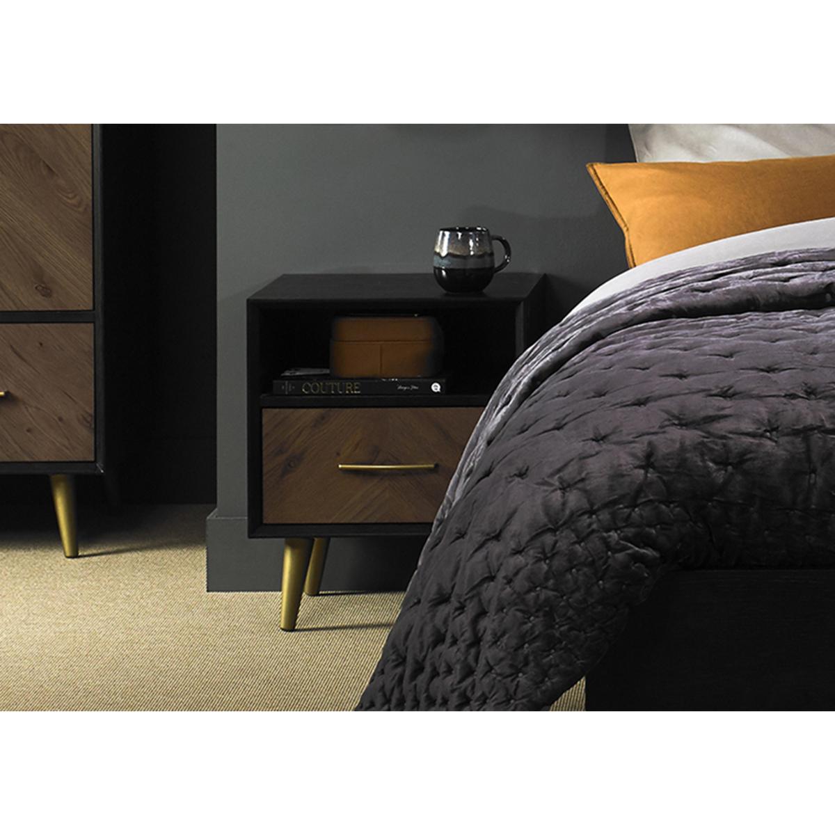 Designed to impress, the Willis collection brings glamour and luxury to any home. The contemporary pieces draw inspiration from mid-century style and showcase a distinctive dark oak veneer finish. Elevate your morning and night routine with the chevron-patterned chests of drawers, bedside cabinets, wardrobe, and dressing table. Expertly crafted with ample storage space and soft-closing drawers, this stunning design makes getting ready enjoyable in so many ways. Whether you choose your favourite piece or group together a few, your bedroom will feel instantly more chic and sophisticated with the Willis range. Make a subtle yet stylish statement with the Willis one-drawer bedside cabinet. Crafted with chic peppercorn detailing, it's the perfect finishing touch. Why you'll love it This 1-drawer bedside cabinet will store all of your evening essentials. Mid-century design with a contemporary feel. Stunning rustic oak veneers and satin brass-effect handles. Cone-shaped legs add a sophisticated touch. Ample storage space. Mitred and bevelled cabinet frame showcases superb craftsmanship. Soft-closing drawers with dovetail joints. This 1-drawer bedside cabinet is part of our Willis range. What you need to know Painted handle and wood legs. Natural timber and veneer will show variation in colour. Knots, filled knots and other markings are to be expected. Avoid placing in direct sunlight or close to a heat source. We recommend using placemats and coasters at all times.