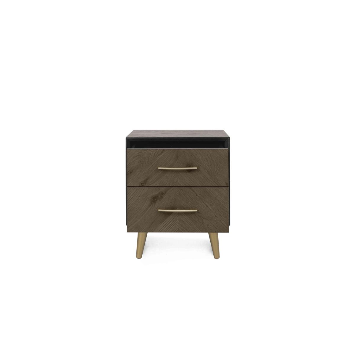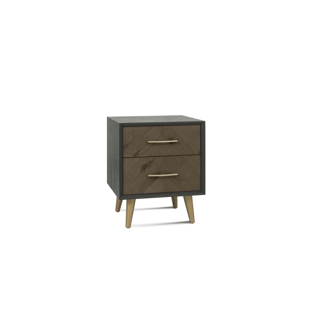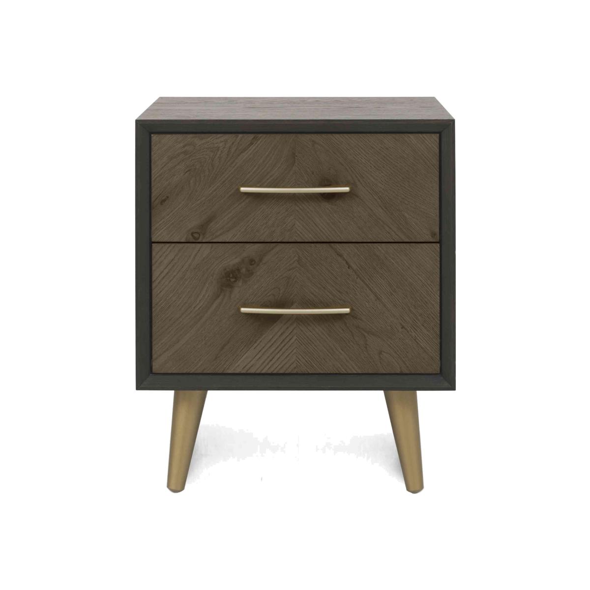 Designed to impress, the Willis collection brings glamour and luxury to any home. The contemporary pieces draw inspiration from mid-century style and showcase a distinctive dark oak veneer finish. Elevate your morning and night routine with the chevron-patterned chests of drawers, bedside cabinets, wardrobe, and dressing table. Expertly crafted with ample storage space and soft-closing drawers, this stunning design makes getting ready enjoyable in so many ways. Whether you choose your favourite piece or group together a few, your bedroom will feel instantly more chic and sophisticated with the Willis range. This two-drawer bedside cabinet is chic, stylish and has plenty of room for your night-time essentials. We can’t get enough of the chevron pattern. Why you'll love it Make a statement with this 2-drawer bedside cabinet. Mid-century style with a contemporary feel. Stunning rustic oak veneers and satin brass-effect handles. Cone-shaped legs add a sophisticated touch. Ample storage space. Mitred and bevelled cabinet frame showcases superb craftsmanship. Soft-closing drawers with dovetail joints. This 2-drawer bedside cabinet is part of our Willis range. What you need to know Painted handles and wood legs. Natural timber and veneer will show variation in colour. Knots, filled knots and other markings are to be expected. Avoid placing in direct sunlight or close to a heat source. We recommend using placemats and coasters at all times.