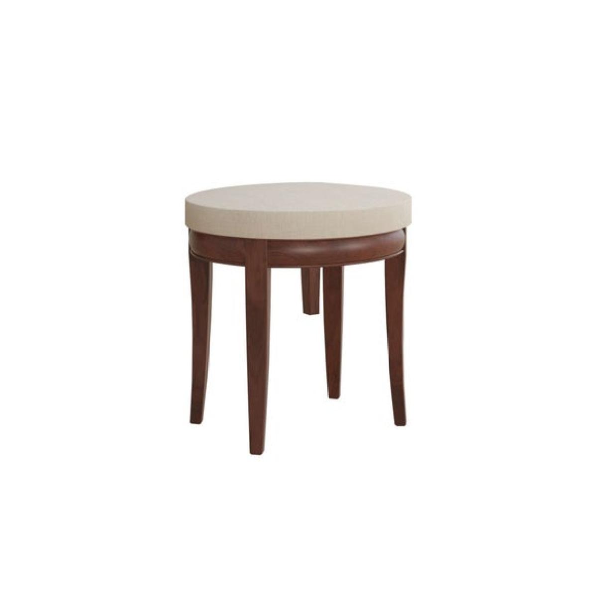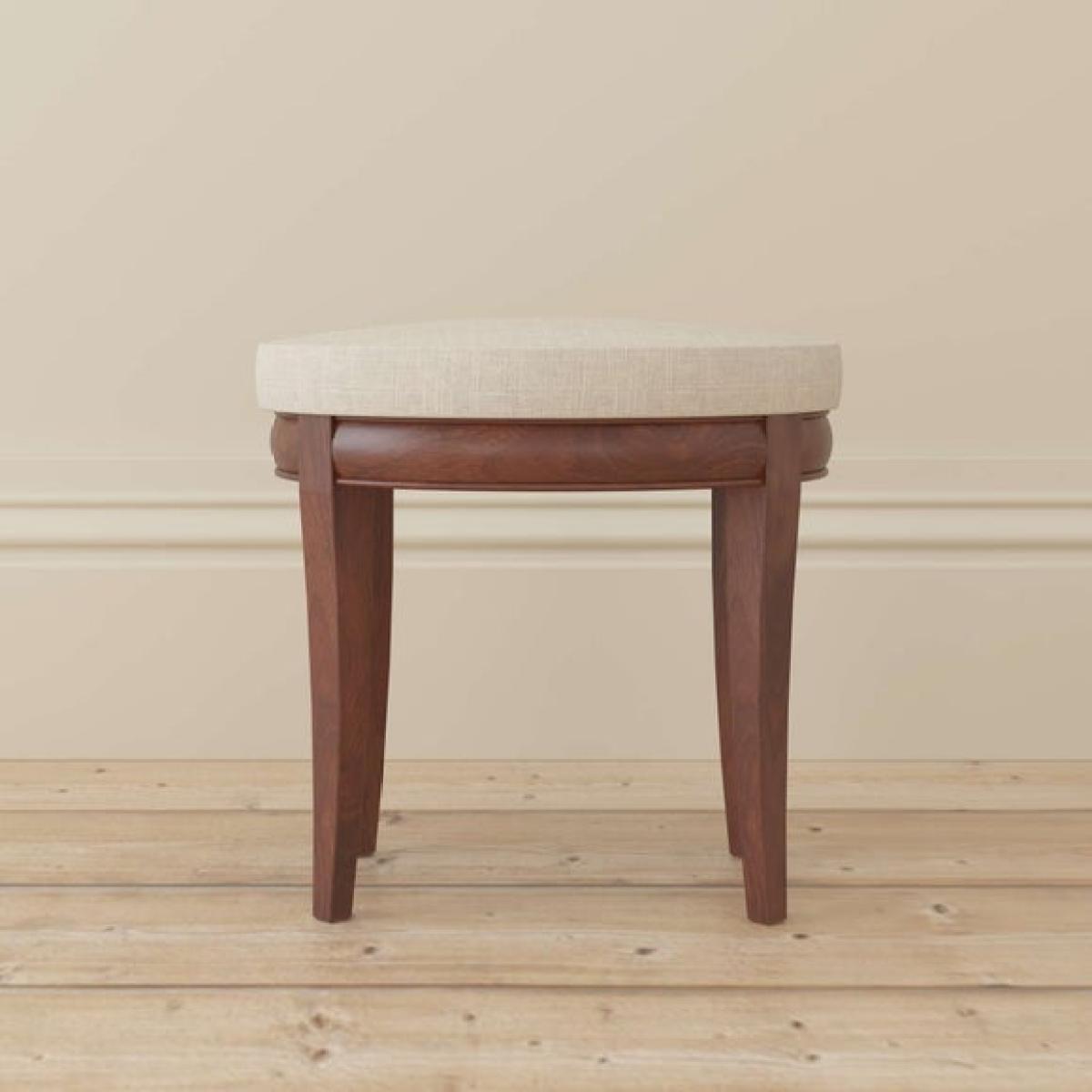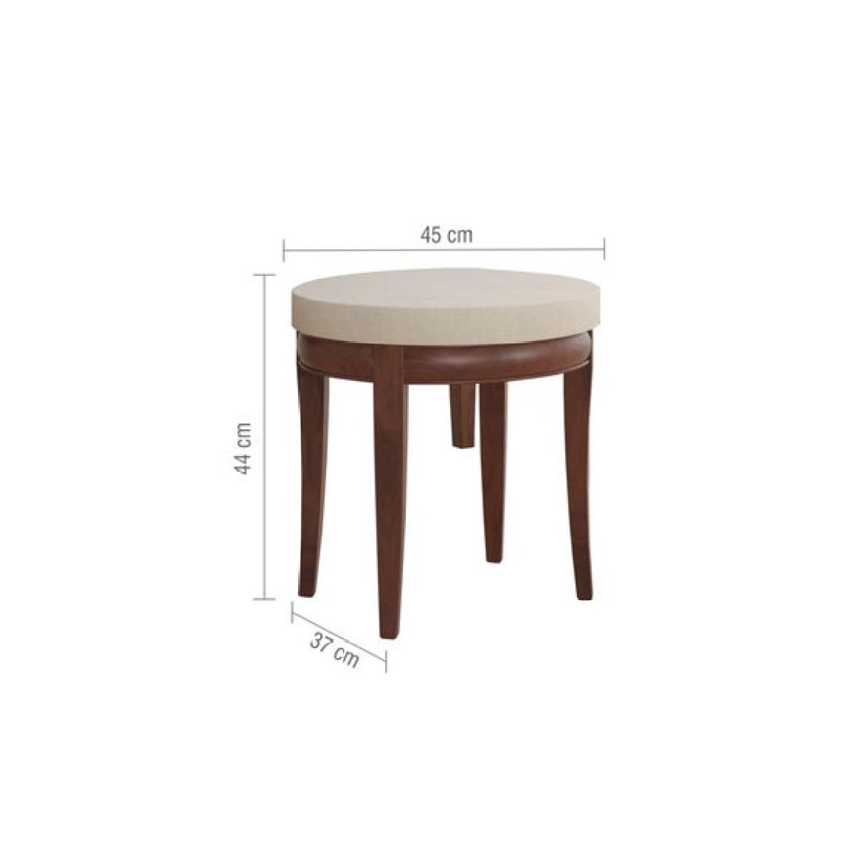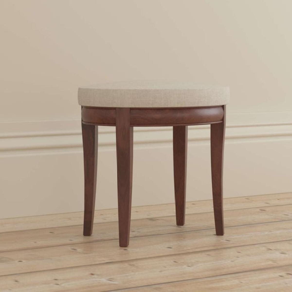 * Wood veneer frame * Cotton/Linen mix upholstery * Soft lacquer finish * Regal elegance style This charming stool is the perfect companion to a dressing table or vanity. Upholstered in a soft cotton-linen blend, it offers a comfortable seat while adding a touch of understated elegance to your room. The solid wood frame is finished in a warm tone that complements traditional interiors beautifully.