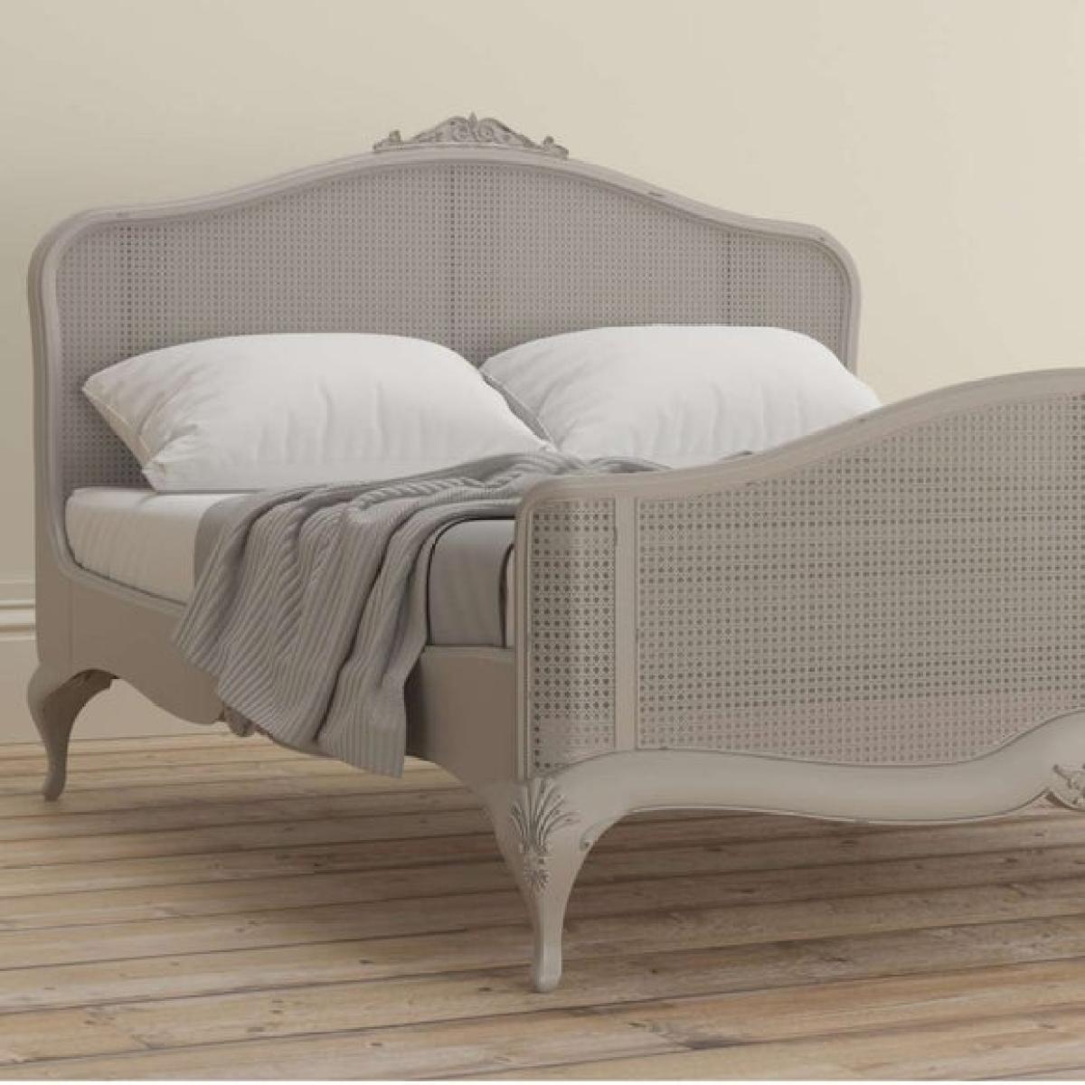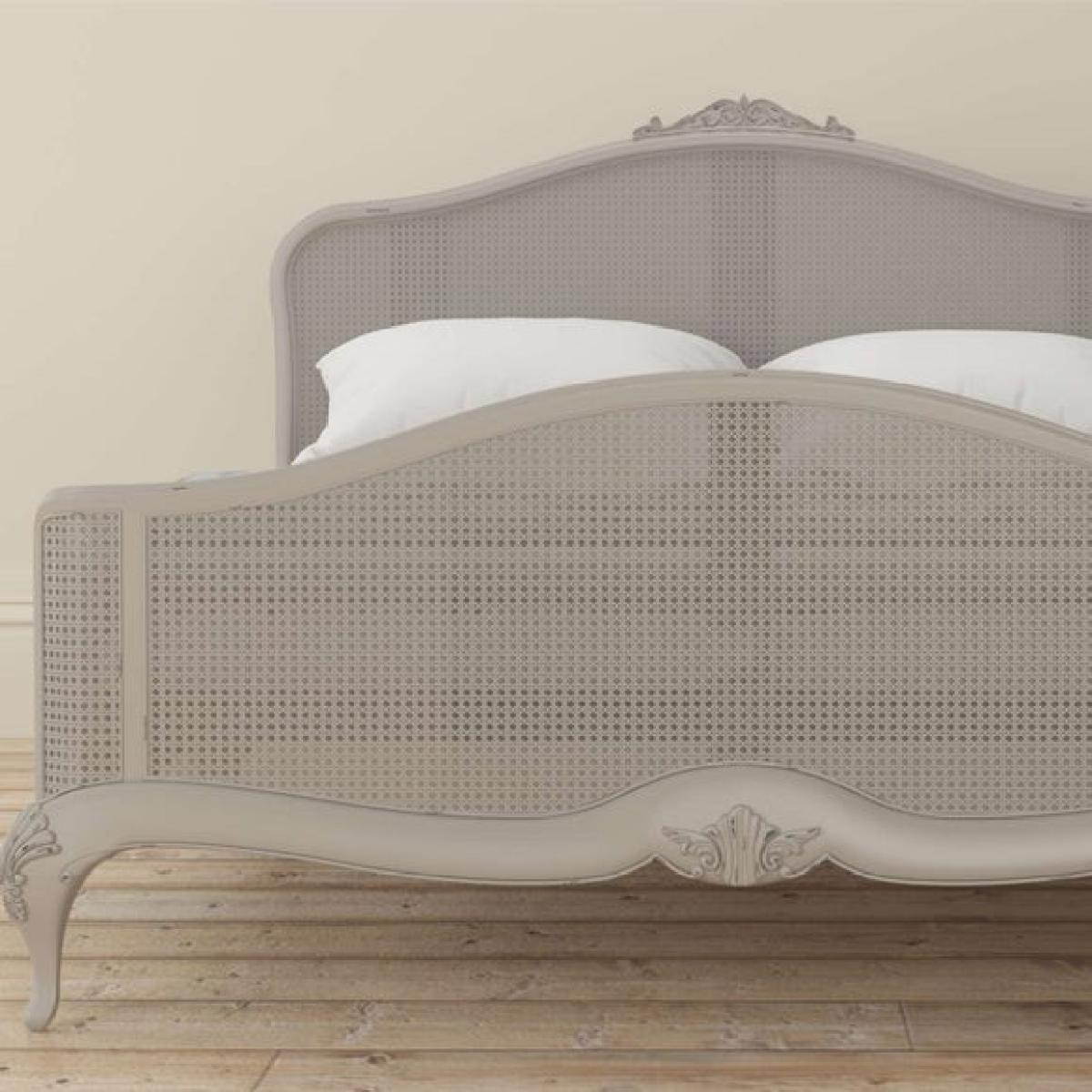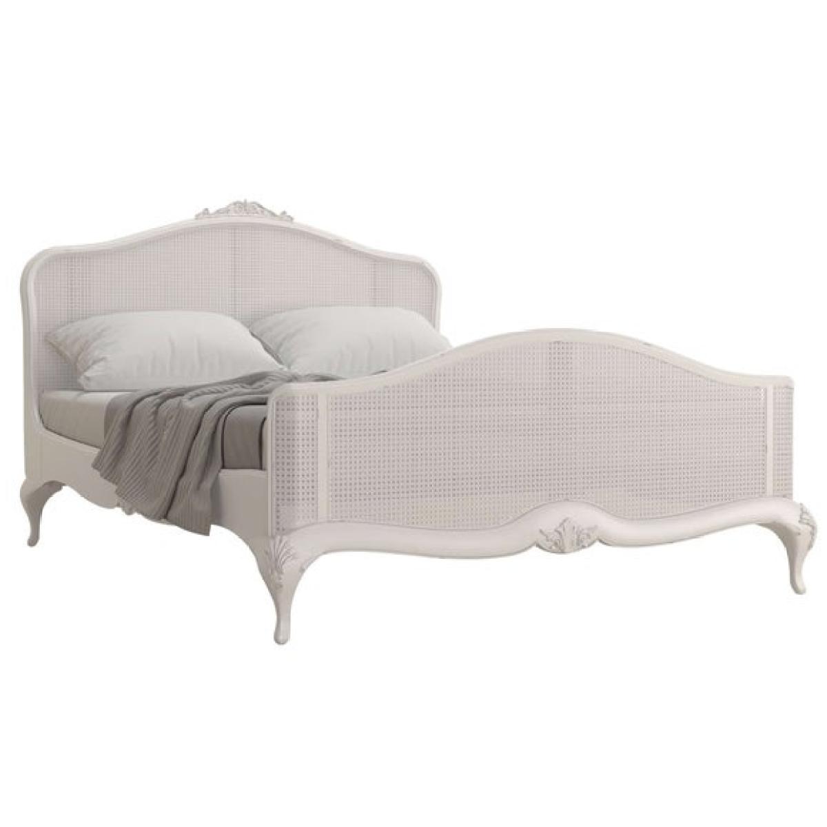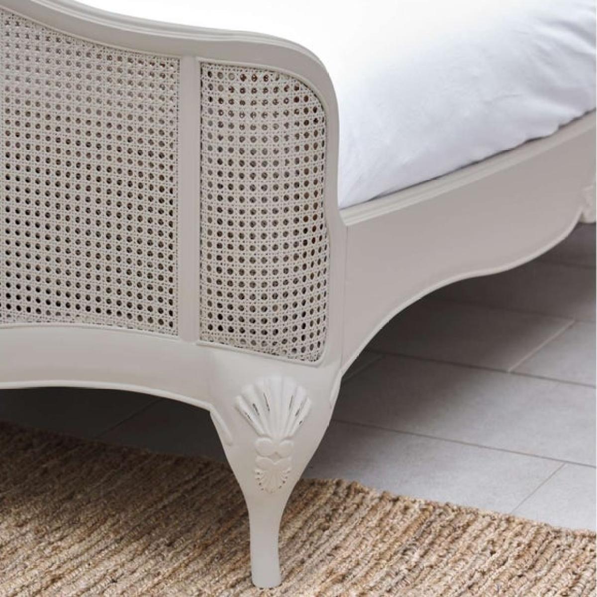 * Solid poplar and Birch veneer frame * Rattan detailing * Soft painted finish * Carved detailing * Sprung slatted base This bed frame is a beautiful blend of comfort and classic design. The rattan panels and carved wooden frame are finished in a soft, distressed tone that adds warmth and texture to your room. Sprung slats ensure a supportive base, while the elegant curves and detailing make it a timeless centrepiece.