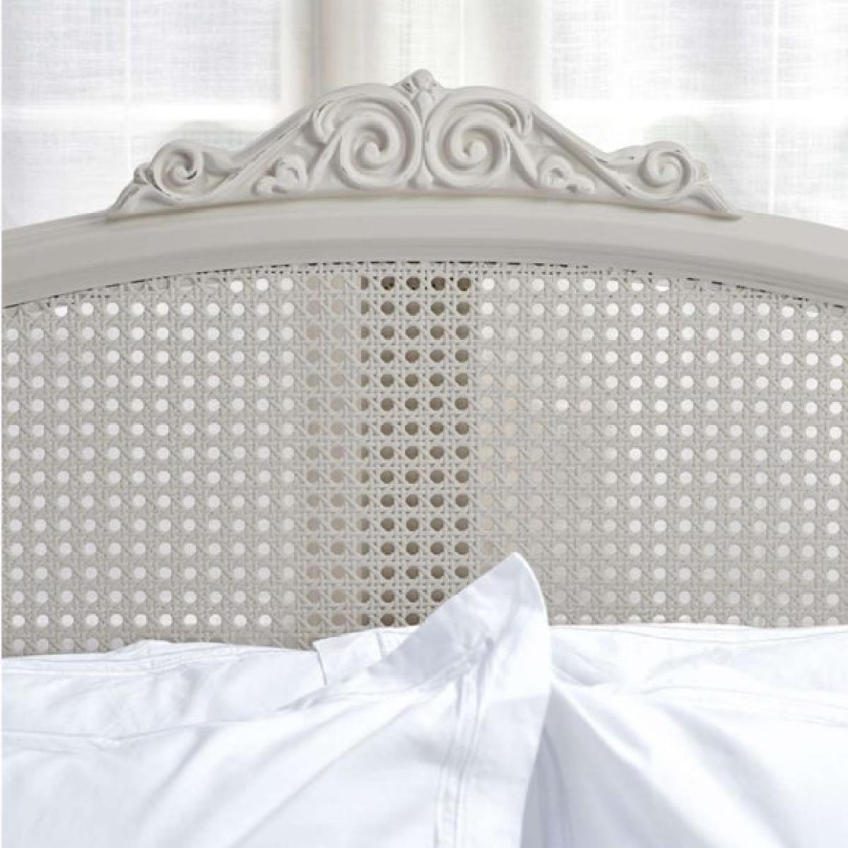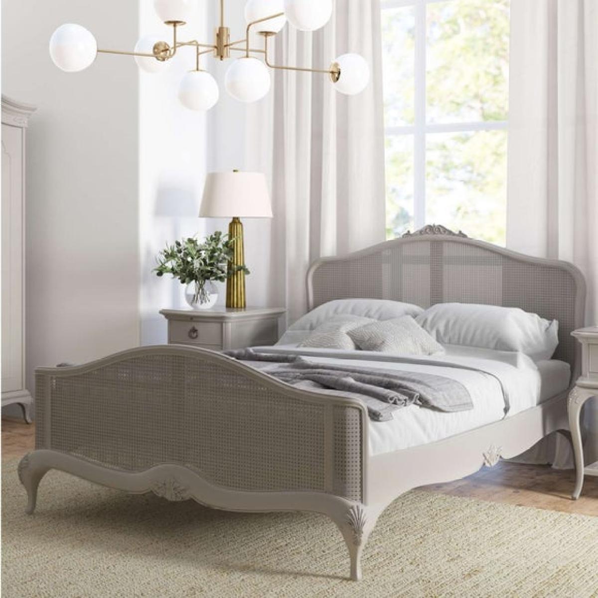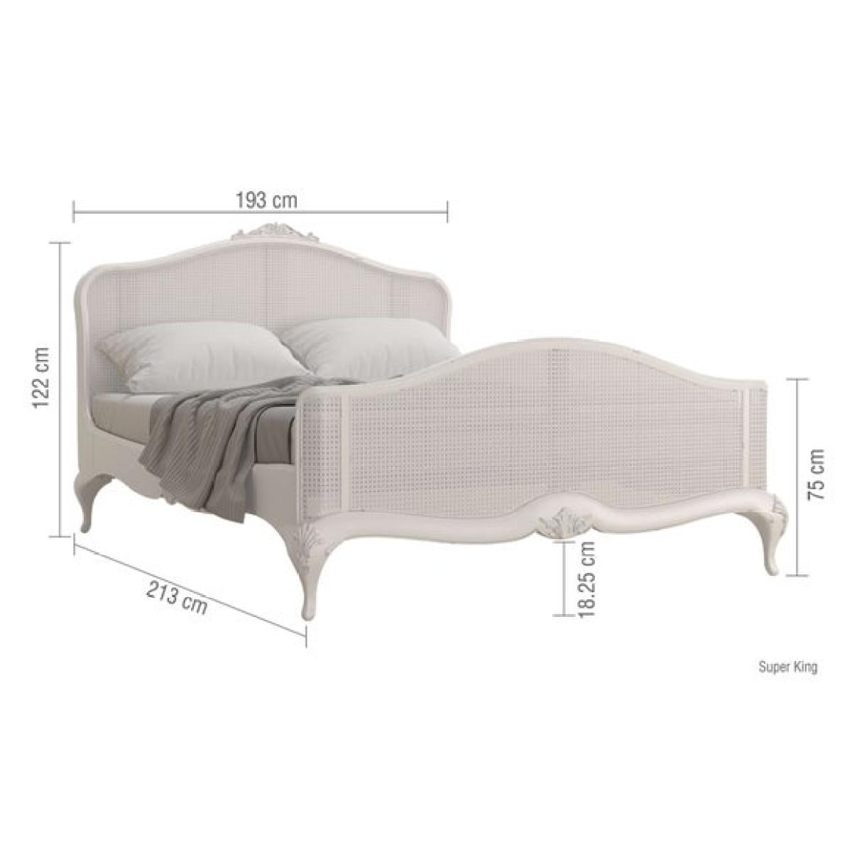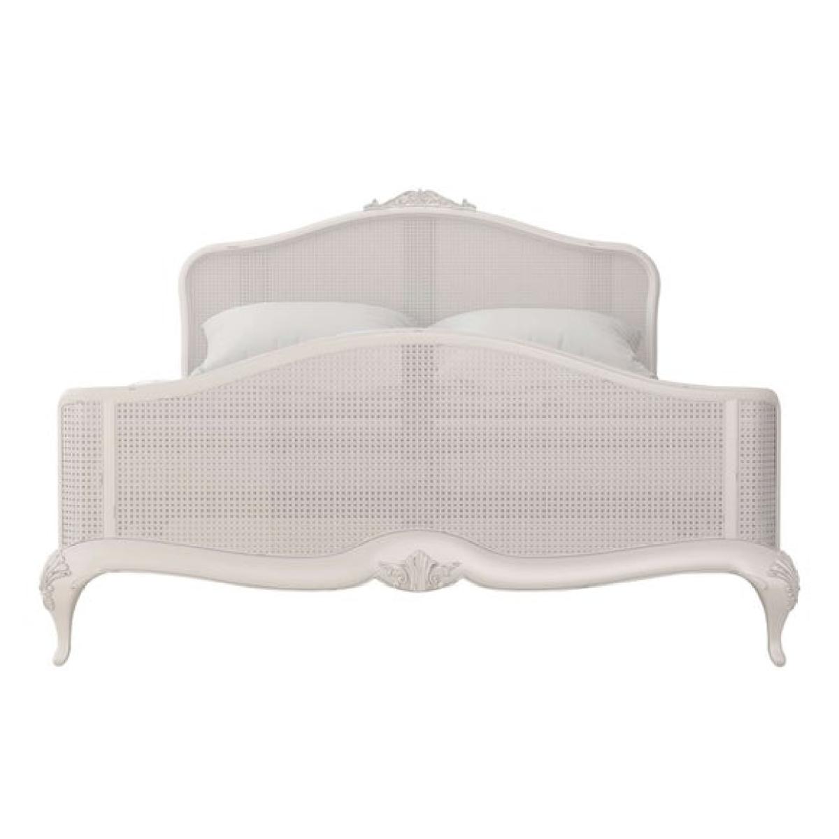 * Solid poplar and Birch veneer frame * Rattan detailing * Soft painted finish * Carved detailing * Sprung slatted base This bed frame is a beautiful blend of comfort and classic design. The rattan panels and carved wooden frame are finished in a soft, distressed tone that adds warmth and texture to your room. Sprung slats ensure a supportive base, while the elegant curves and detailing make it a timeless centrepiece.