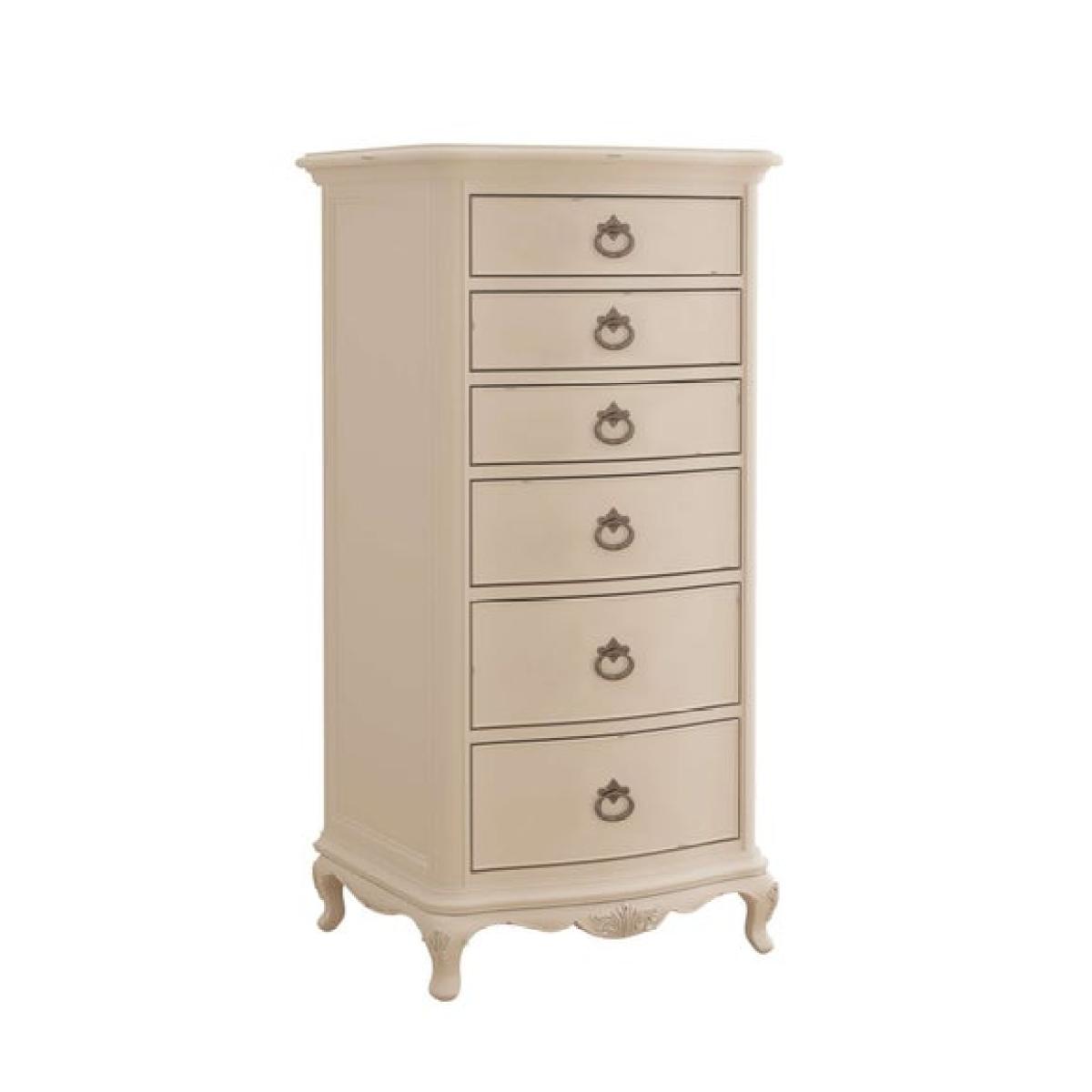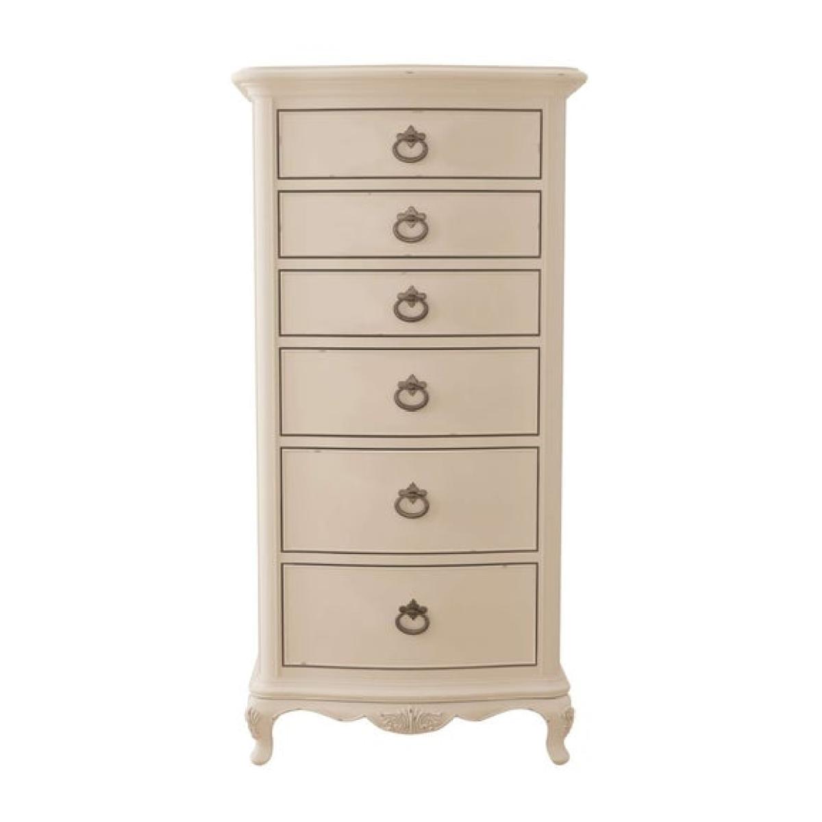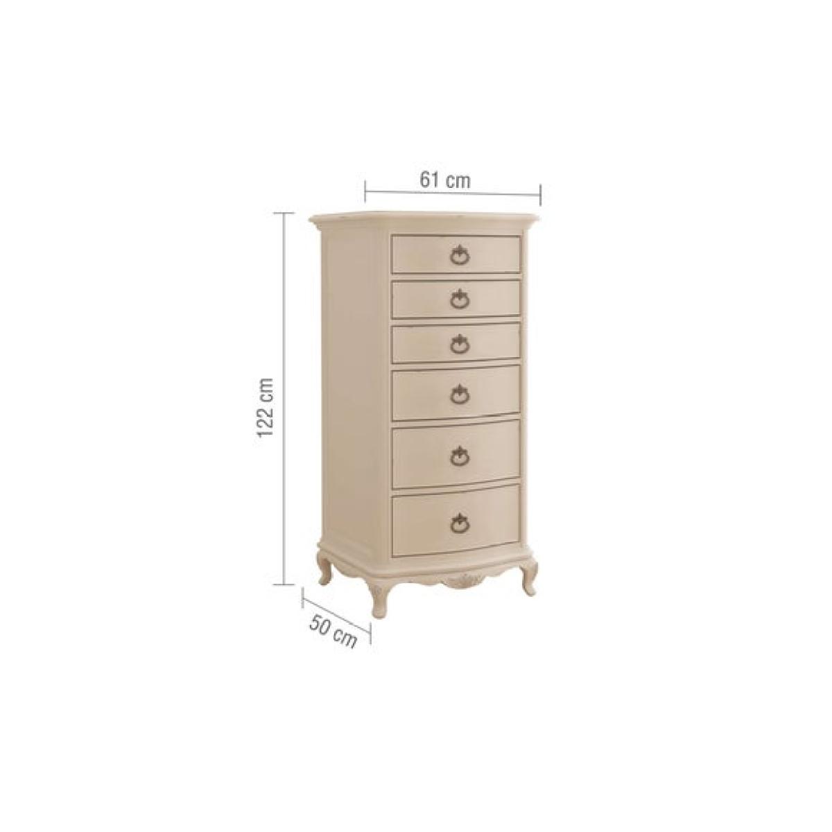 * Solid Poplar and Birch veneer frame * Soft painted finish * Carved tailing * Antique bronze hardware This tall chest of drawers is ideal for maximising storage in a compact footprint. With six drawers, including two extra-deep compartments, it offers ample space for clothing and accessories. The soft painted finish is lightly distressed to highlight the carved detailing, while antique-style bronze handles add a vintage touch. Built with dovetail joints for lasting durability, it’s a practical and elegant solution for any bedroom.