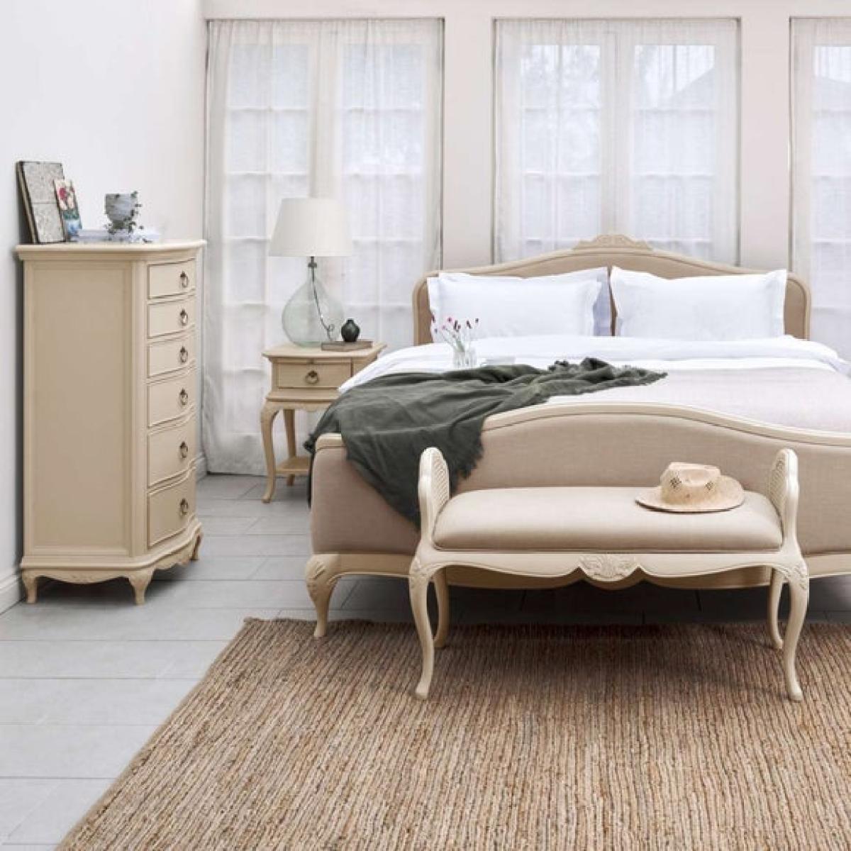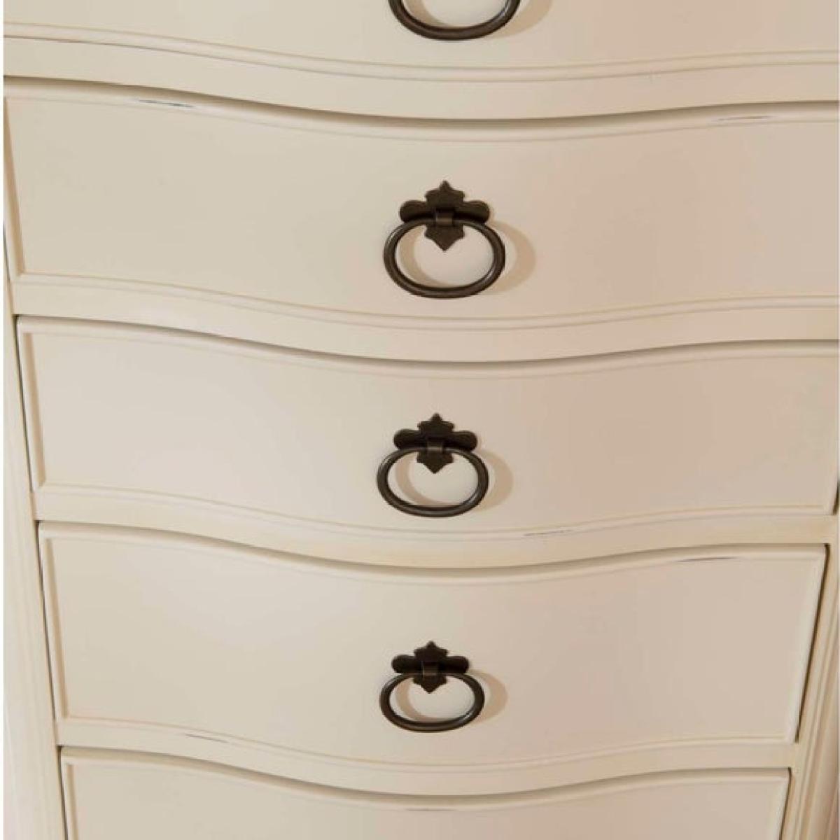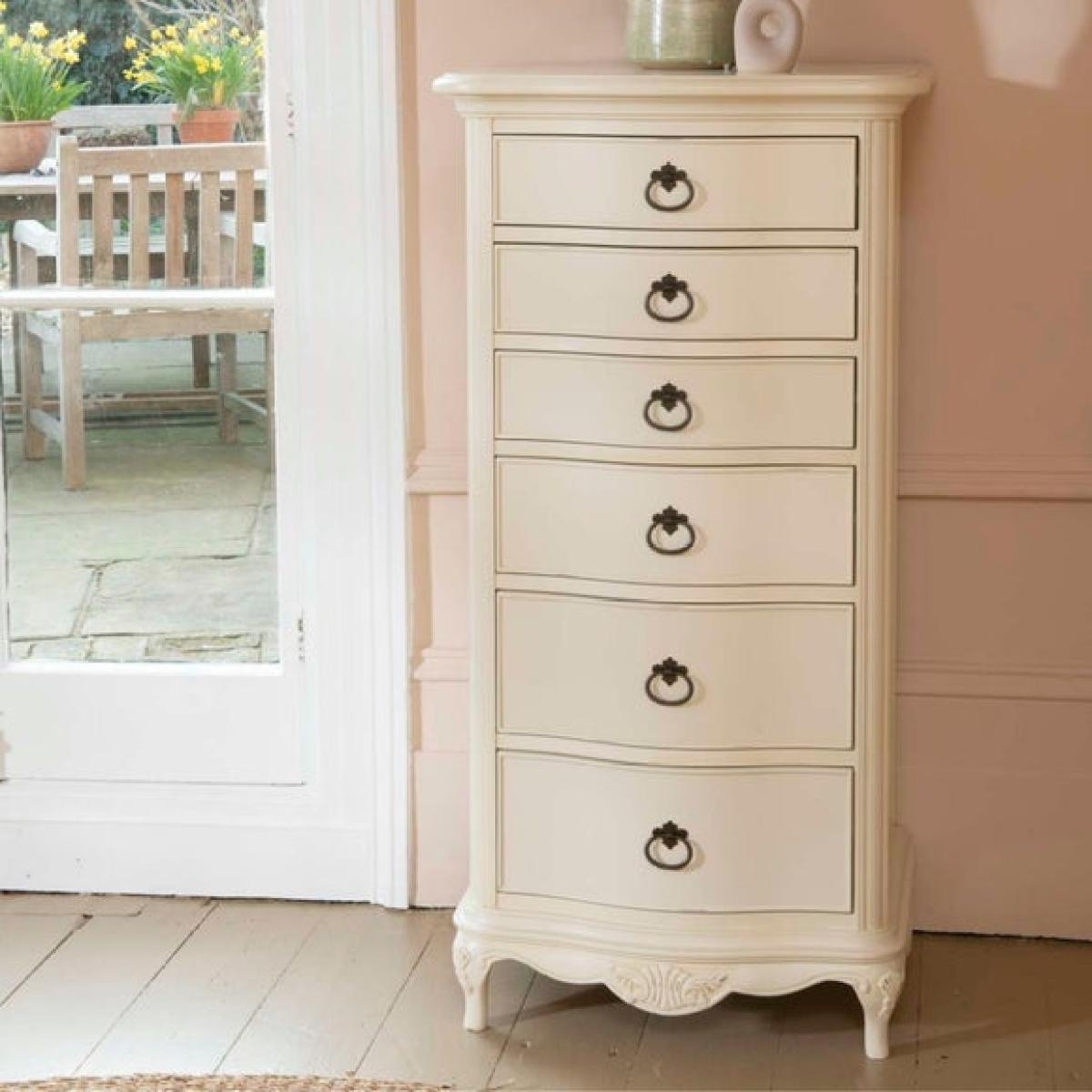 * Solid Poplar and Birch veneer frame * Soft painted finish * Carved tailing * Antique bronze hardware This tall chest of drawers is ideal for maximising storage in a compact footprint. With six drawers, including two extra-deep compartments, it offers ample space for clothing and accessories. The soft painted finish is lightly distressed to highlight the carved detailing, while antique-style bronze handles add a vintage touch. Built with dovetail joints for lasting durability, it’s a practical and elegant solution for any bedroom.