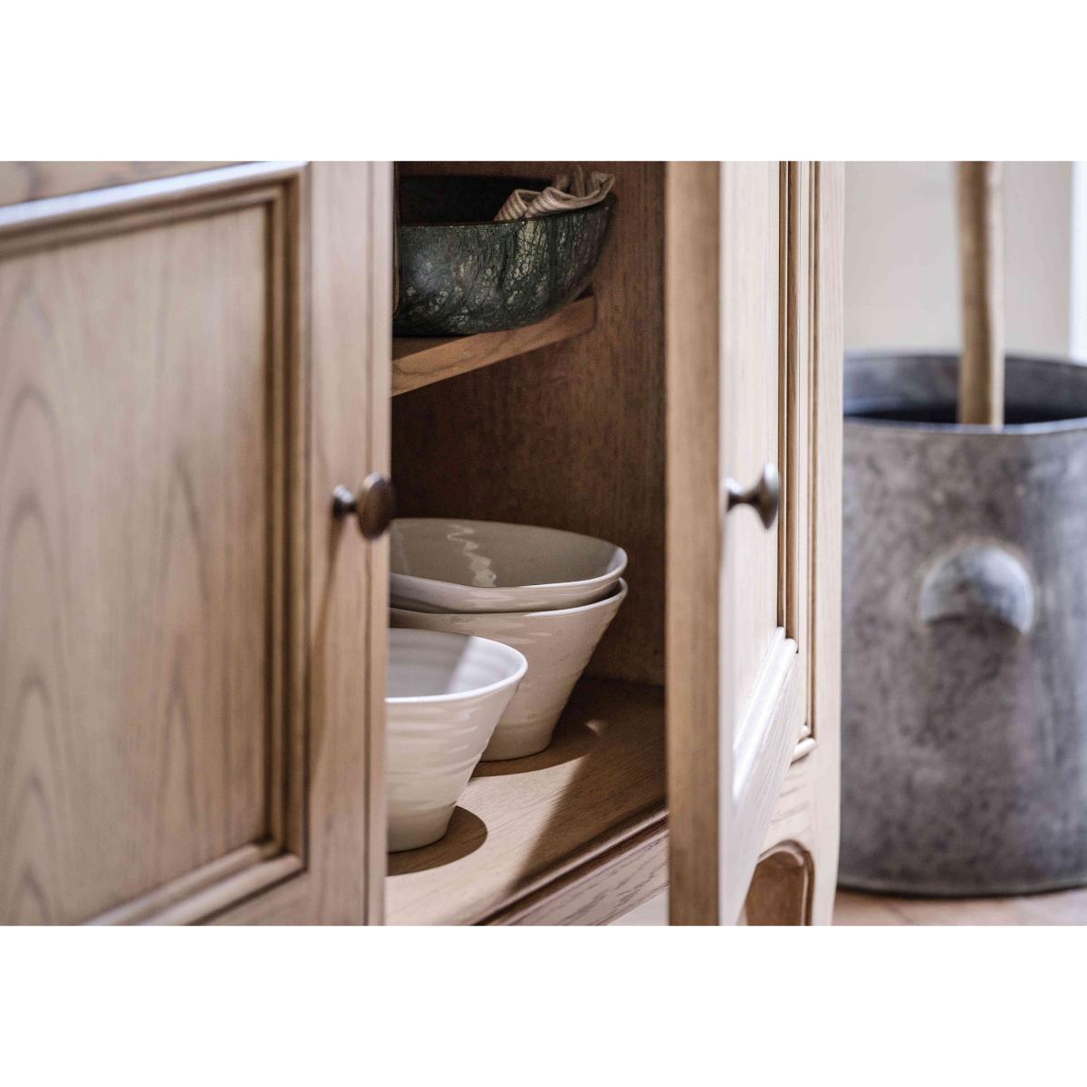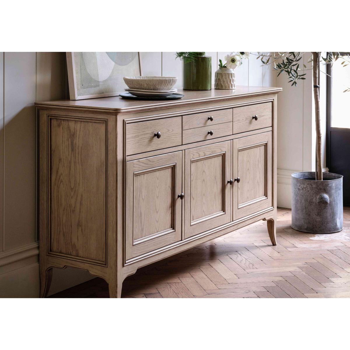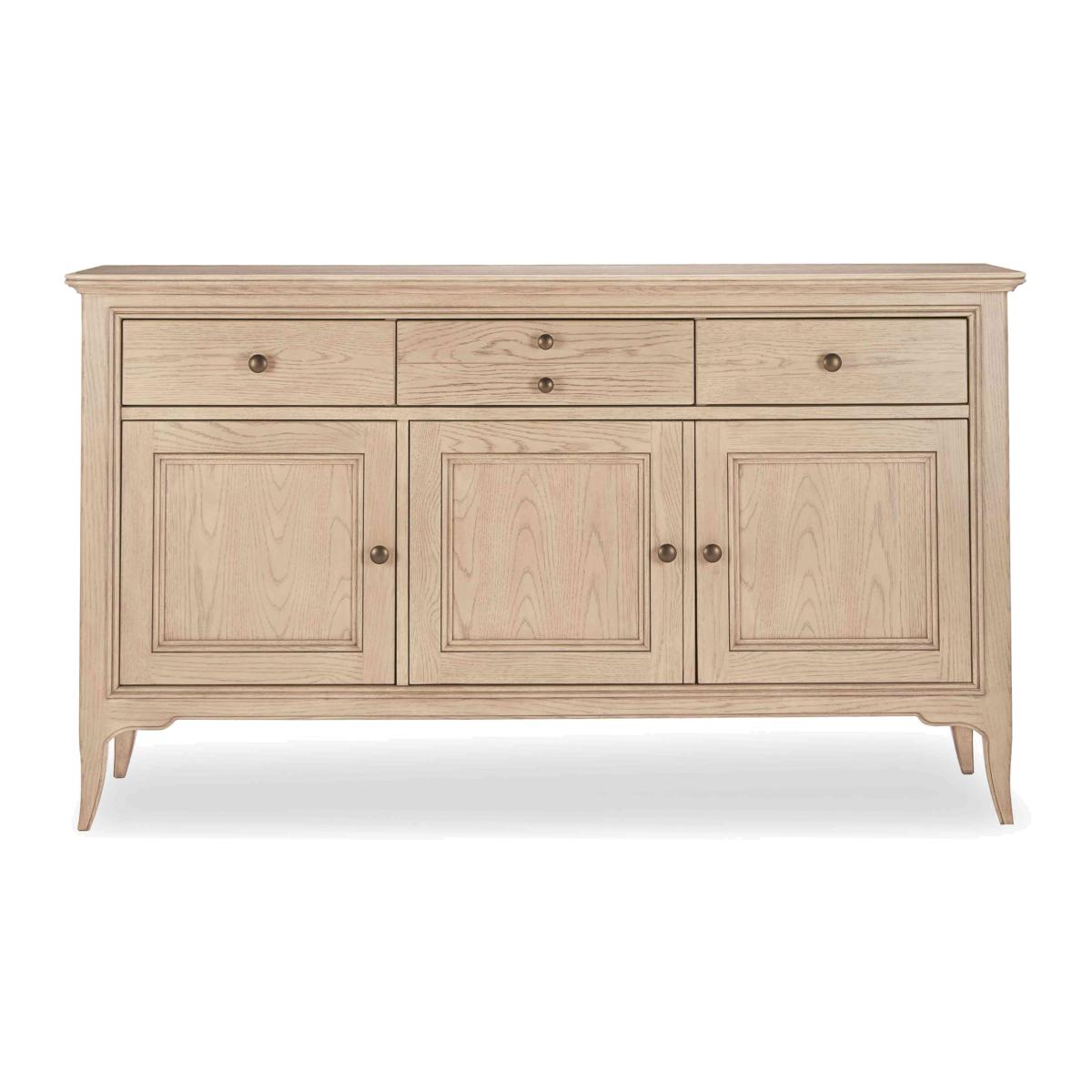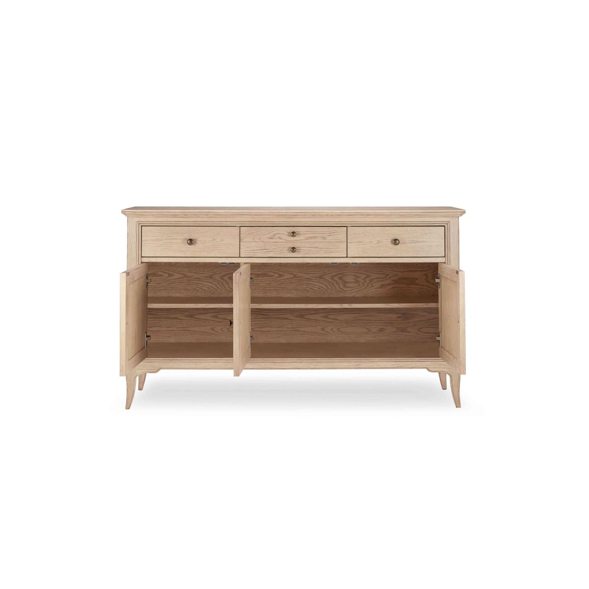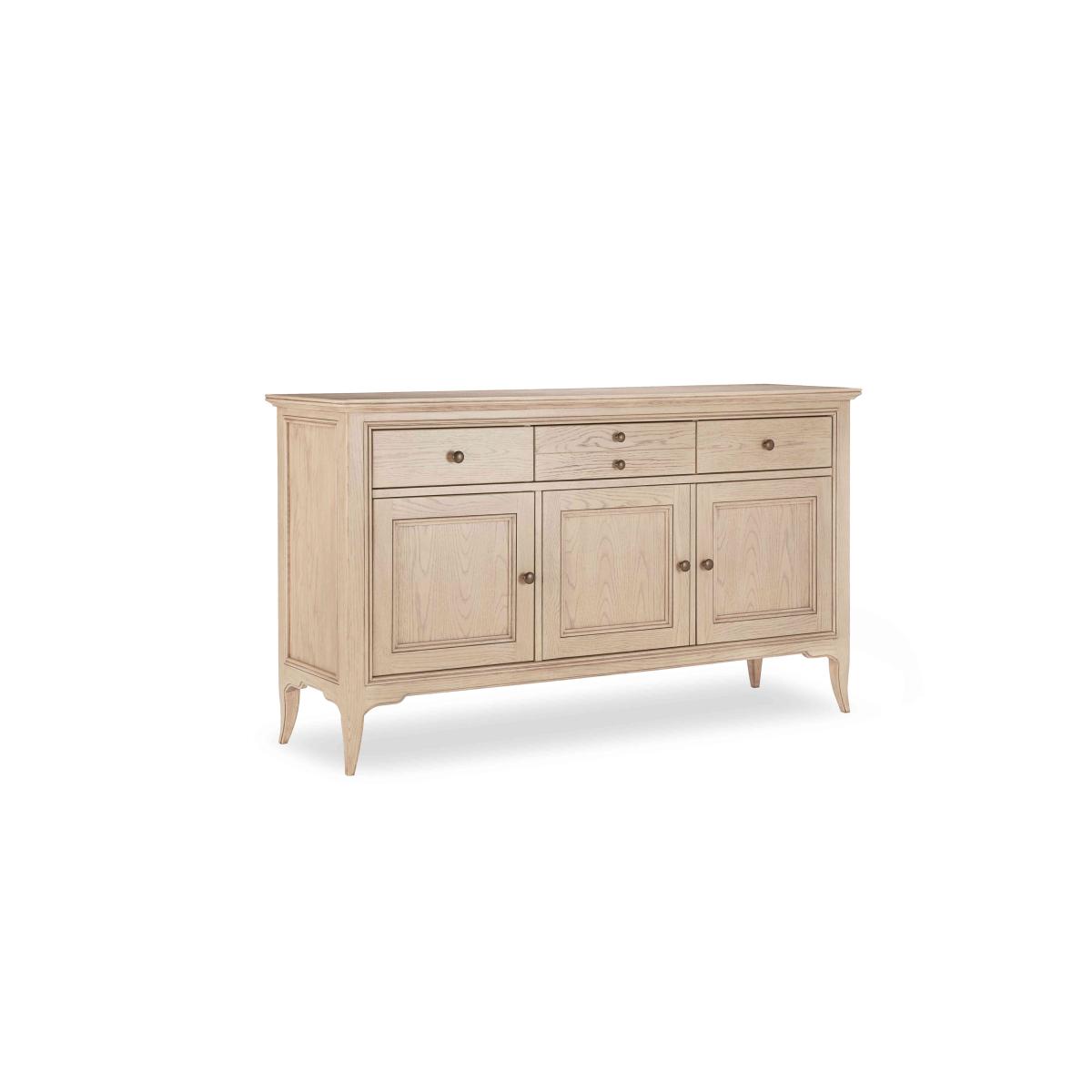 Classic French furniture is reimagined – quite beautifully – in the Willis and Gambier Toulon range. Handcrafted in solid oak, this collection includes pieces for bedrooms, living rooms and dining rooms and all showcase a wealth of wonderful and well-executed details. Superior cabinetry techniques that include carved profiles, beading, panelling and elegantly tapered legs quickly identify the collection as being handcrafted to the very highest standards, while the finishing touches – soft-closing drawers and cupboard doors and well-designed storage spaces, for example – speak to the range’s twenty-first century sensibilities. Eminently suitable for both traditional and contemporary homes, the Toulon range is, indeed, a modern classic. Spacious and beautifully handcrafted, this three-door sideboard with drawers is inspired by classic French cabinetry style. Why you'll love it Inspired by classic French furniture, the Toulon range brims with charm and style. This sideboard showcases a wealth of refined details. Elegant curved and tapered legs. Rows of beading. Lower edge has beautifully carved profiles. 2 soft-close cupboards and 4 soft-close drawers. With authentically aged brass pulls. Made of solid oak, carefully selected for its character and quality. Hand-finished with a white-hued lacquer for a timeless look. Handcrafted by Willis & Gambier. This sideboard is part of the Toulon range. What you need to know 1 single-door cupboard and 1 double-door cupboard each with a fixed shelf. No two pieces of solid wood are the same. Variations in colour will occur. As wood is a natural product, you can expect to see knots which may be filled. Avoid placing in direct sunlight or close to a heat source. We recommend using coasters and placemats at all times. Wipe clean with a damp cloth and then dry using a soft duster. Do not use silicon-based furniture polish or abrasive cleaners. WARNING!