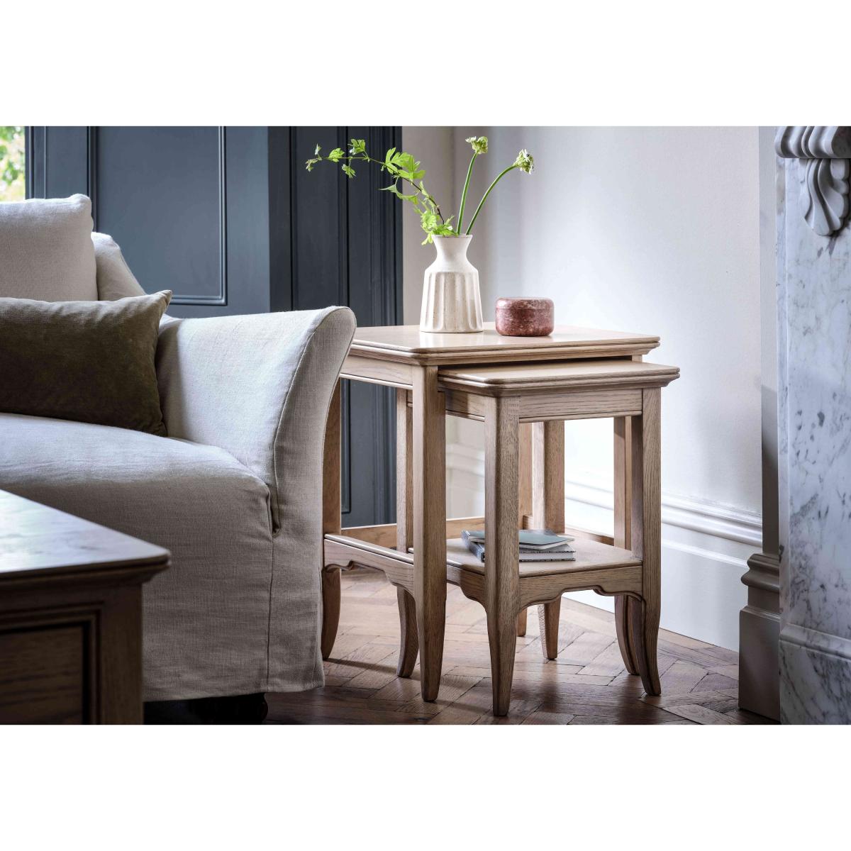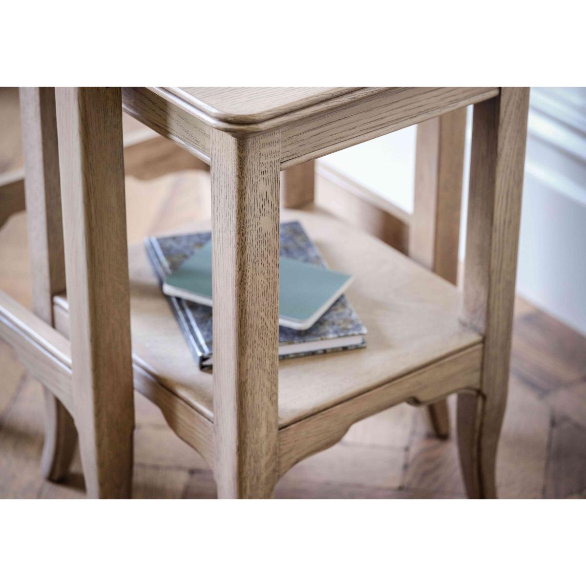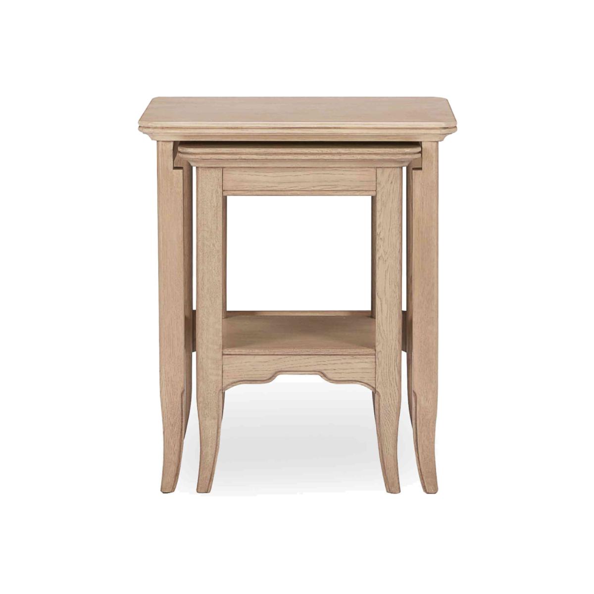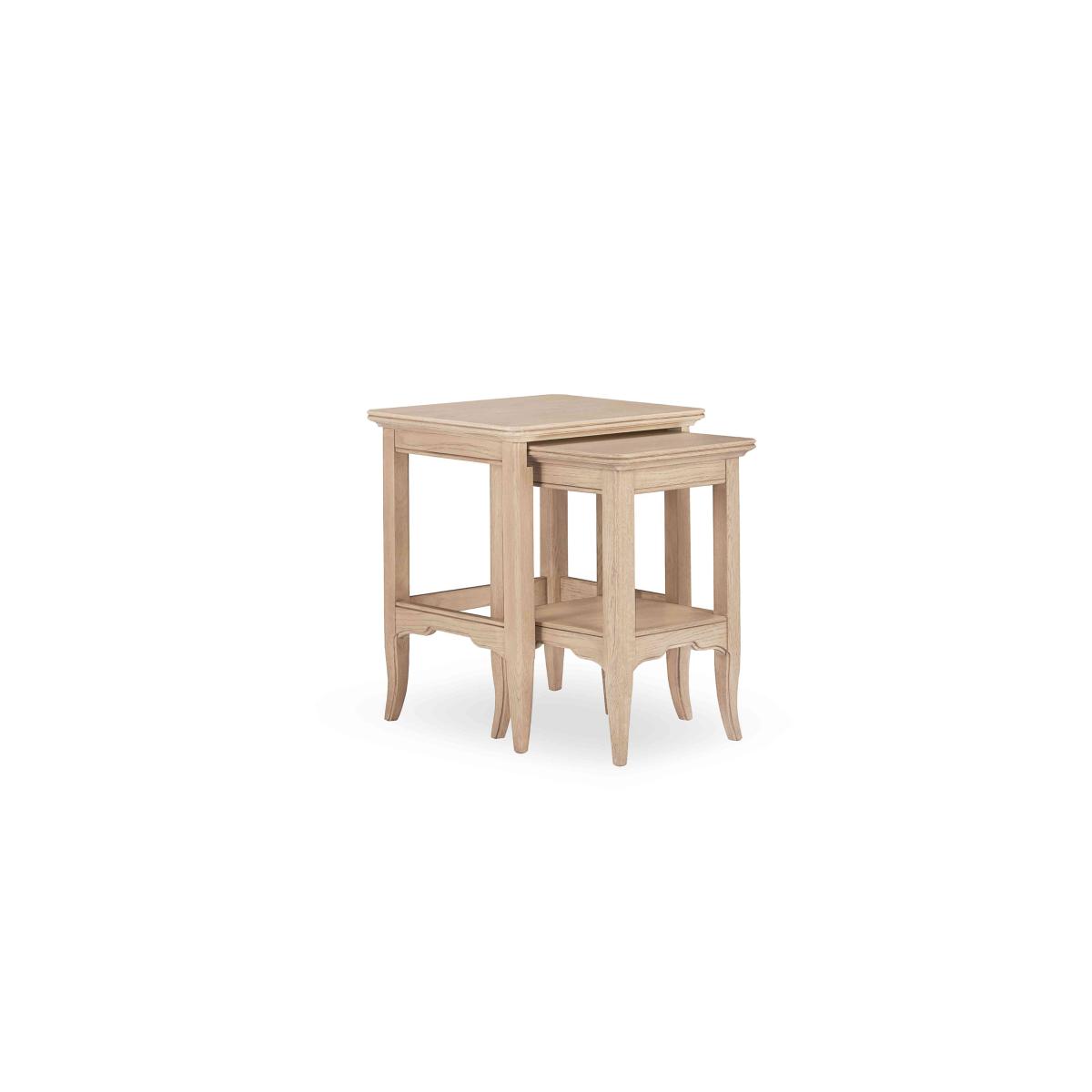 Classic French furniture is reimagined – quite beautifully – in the Willis and Gambier Toulon range. Handcrafted in solid oak, this collection includes pieces for bedrooms, living rooms and dining rooms and all showcase a wealth of wonderful and well-executed details. Superior cabinetry techniques that include carved profiles, beading, panelling and elegantly tapered legs quickly identify the collection as being handcrafted to the very highest standards, while the finishing touches – soft-closing drawers and cupboard doors and well-designed storage spaces, for example – speak to the range’s twenty-first century sensibilities. Eminently suitable for both traditional and contemporary homes, the Toulon range is, indeed, a modern classic. An excellent choice for a smaller living room, this handcrafted nest of two tables is practical as well as beautiful. Clearly inspired by classic French furniture design, tables feature wonderful details. Why you'll love it Inspired by classic French furniture, the Toulon range brims with charm and style. This nest of 2 tables showcases a wealth of refined details. Elegant curved and tapered legs. Rows of beading. The smaller table has a useful lower shelf with a beautifully carved profile. Tables are made of solid oak, carefully selected for its character and quality. Hand-finished with a white-hued lacquer for a timeless look. Handcrafted by Willis & Gambier. This nest of 2 tables is part of the Toulon range. What you need to know No two pieces of solid wood are the same. Variations in colour will occur. As wood is a natural product, you can expect to see knots which may be filled. Avoid placing in direct sunlight or close to a heat source. We recommend using coasters and placemats at all times. Wipe clean with a damp cloth and then dry using a soft duster. Do not use silicon-based furniture polish or abrasive cleaners.
