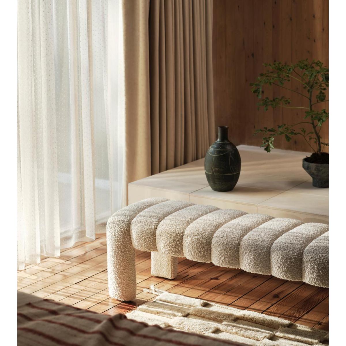 I’m a big fan of this boucle bench for its soft, inviting texture and subtle sculptural form. Its gentle curves and natural hue slot neatly into Scandi, modern-minimal or mid-century-inspired schemes, adding warmth without clutter. For styling, try placing it at the foot of your bed with a slim tray and a folded wool throw, or use it as extra seating in a hallway, paired with a tapered console and woven basket underneath. In a living room, swap a low coffee table for the bench on a neutral rug and top it with a stack of design books and a small plant.