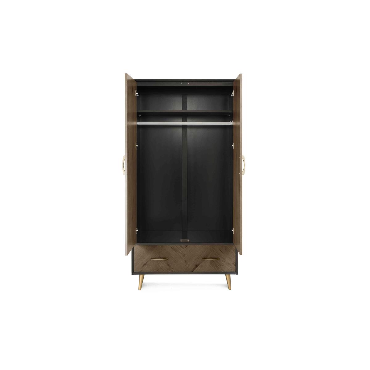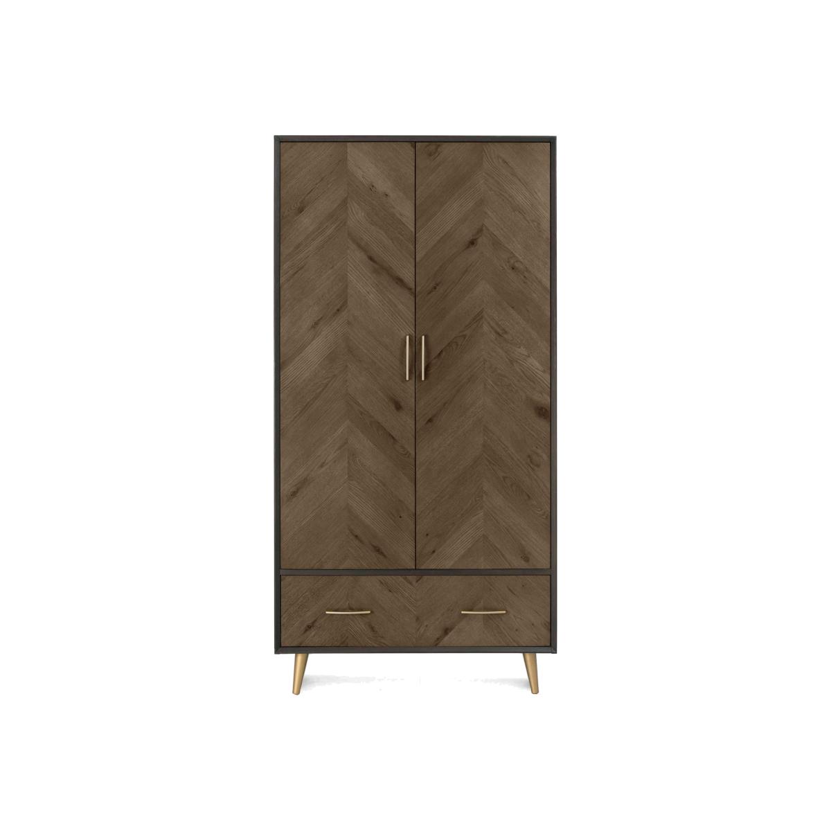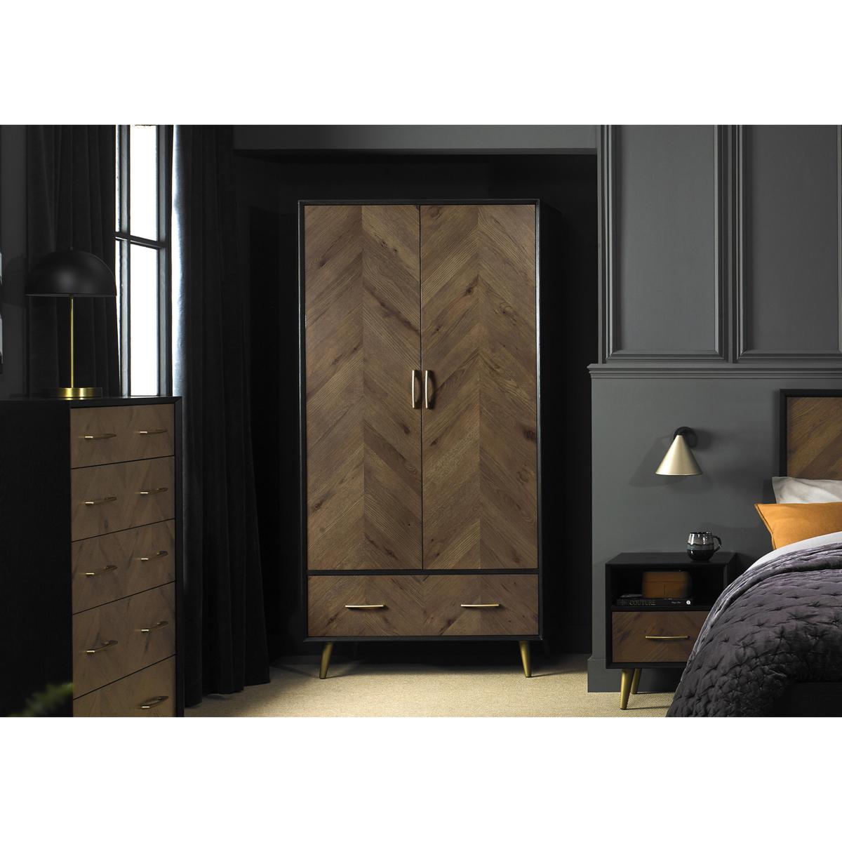 Designed to impress, the Willis collection brings glamour and luxury to any home. The contemporary pieces draw inspiration from mid-century style and showcase a distinctive dark oak veneer finish. Elevate your morning and night routine with the chevron-patterned chests of drawers, bedside cabinets, wardrobe, and dressing table. Expertly crafted with ample storage space and soft-closing drawers, this stunning design makes getting ready enjoyable in so many ways. Whether you choose your favourite piece or group together a few, your bedroom will feel instantly more chic and sophisticated with the Willis range. A contemporary take on classic design, the Willis double wardrobe has timeless appeal. Its fumed oak finish and metallic handles are a perfect contrast. Why you'll love it This double wardrobe is stylish and surprisingly spacious. Mid-century style with a modern feel. Stunning rustic oak veneers and satin brass-effect handles. Cone-shaped legs add a sophisticated touch. Deep drawer for more storage space. Mitred and bevelled frame showcases superb craftsmanship. Soft-closing drawer with dovetail joints. This 5-drawer chest is part of our Willis range. What you need to know Features 1 shelf and 1 hanging rail. Painted metal handles and wood legs. Natural timber and veneer will show variation in colour. Knots, filled knots and other markings are to be expected. Avoid placing in direct sunlight or close to a heat source. We recommend using placemats and coasters at all times. WARNING!
