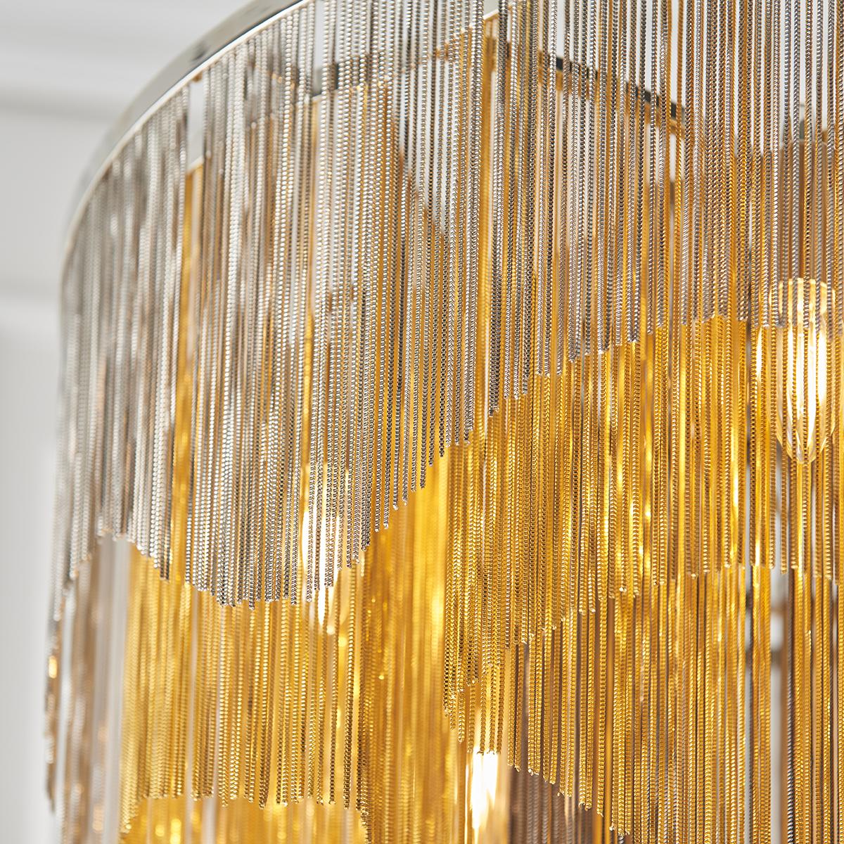 I really love this cascading chain pendant because of its versatile look and contemporary appeal, which makes it a great feature piece for various interiors. It works particularly well in eclectic, modern, or boho-styled spaces, adding a touch of visual interest without overwhelming the room. Practical styling tips include hanging it in a dining room or above a statement console to create a focal point, and pairing it with softer, neutral palettes to let the multi-tone metal finish stand out. When styling, consider how the different tones can complement other metal accents within the space for a cohesive look. The layered chain design also helps diffuse light beautifully, adding warmth and a subtle glow to the room.
