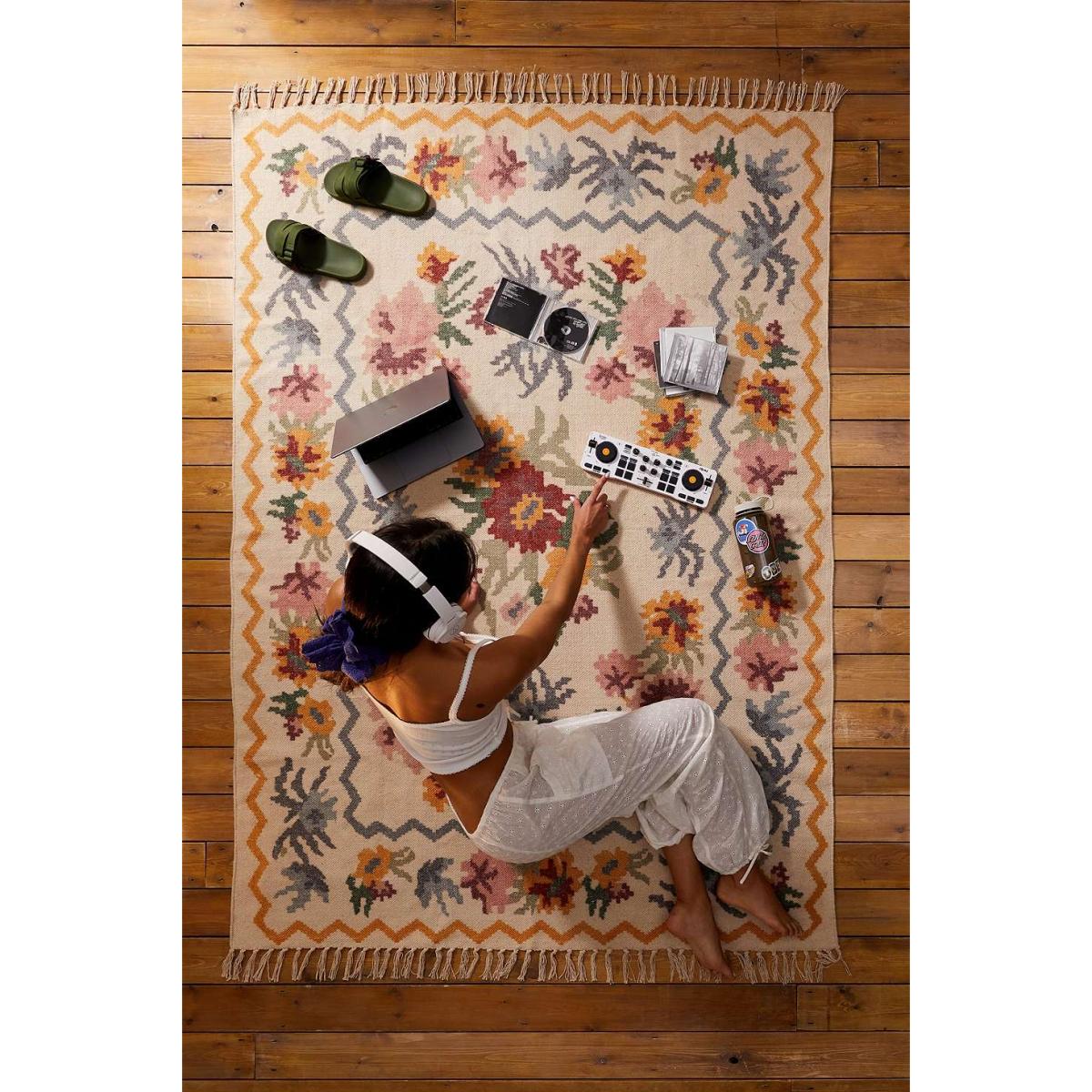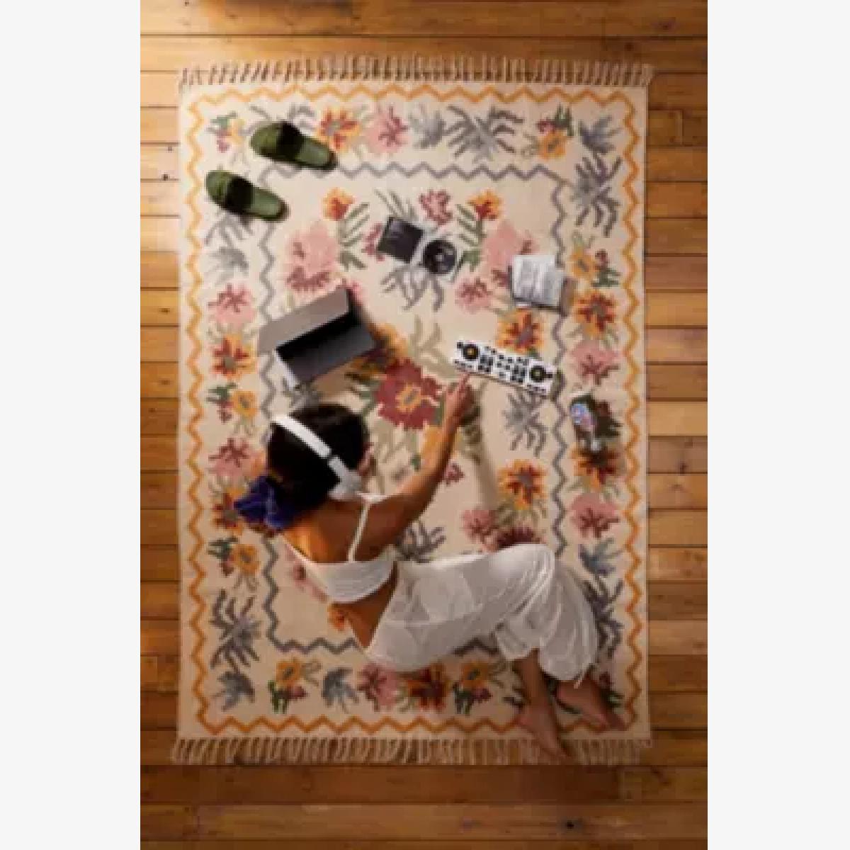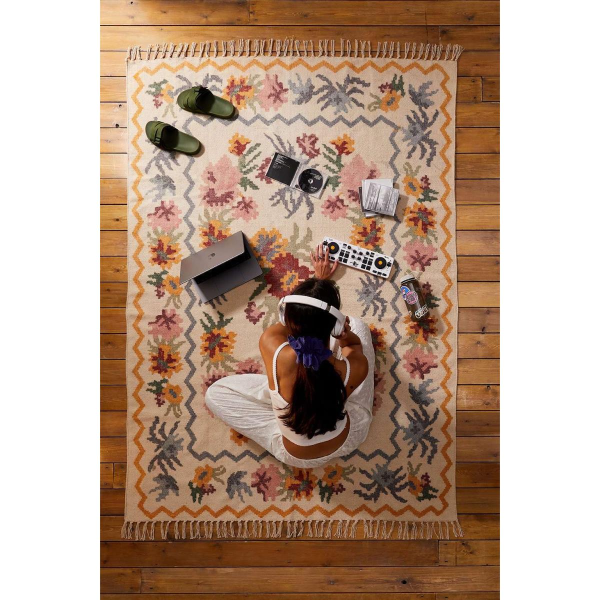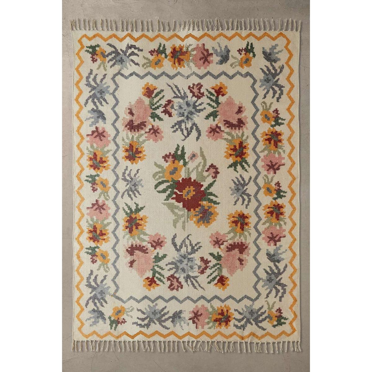 Add a homely feel to your space with this floral rug. Woven fabrication with tassel trims to either side. Features a floral design complete with geometric borders. **Content + Care** \- 100% Cotton \- Spot clean **Size** \- 152.4cm x 213.3cm (5ft x 7ft)