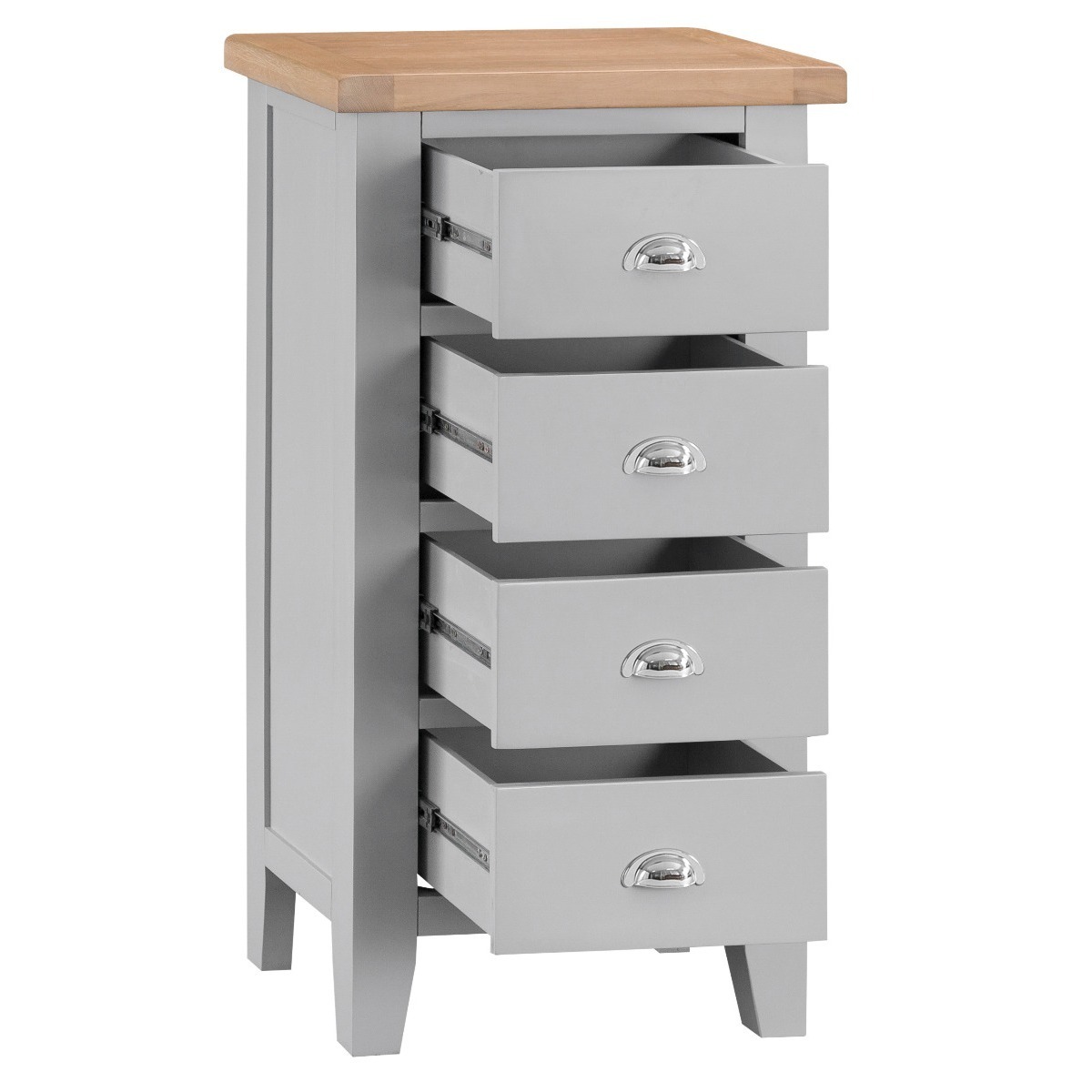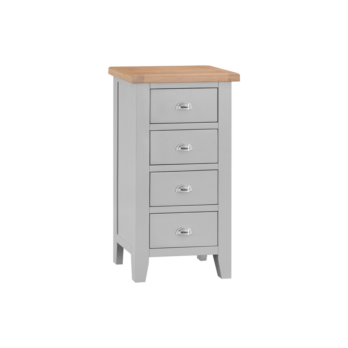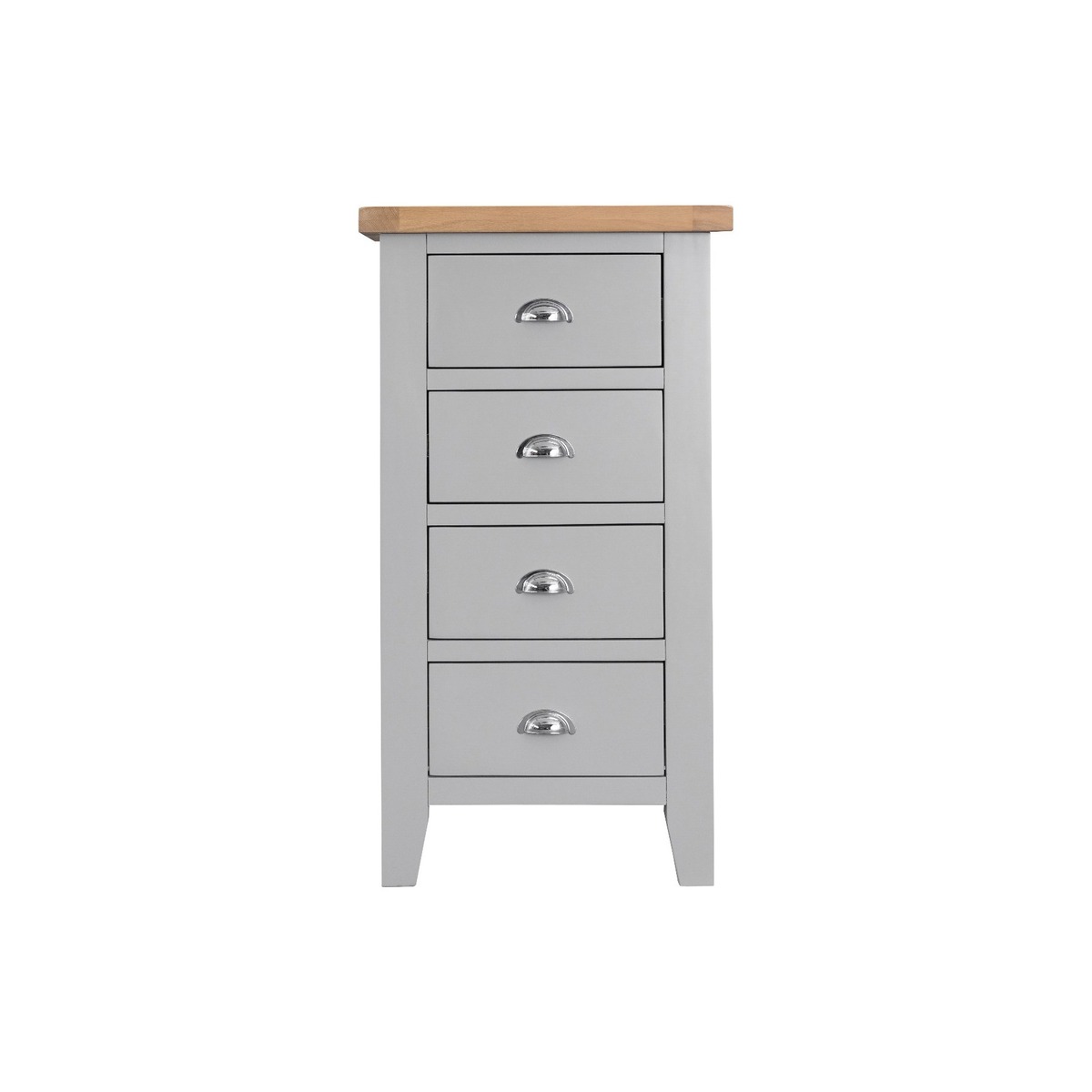 Stylish and space saving, the Willow Oak and Grey 4 Drawer Narrow Chest is a stunning addition to any bedroom. The practical chest of drawers features 4 handy drawers offering plenty of storage space and is complete with an attractive two-toned oak and grey painted finish. Stylish narrow chest of drawers. Attractive two-toned design with a lime washed oak top and millstone grey painted frame. Narrow and space-saving; perfect for bedrooms of every size. Drawers on metal guides. Sleek cup handles for a touch of contemporary style. Complete the look with other items in the Willow Oak and Grey Bedroom Collection.